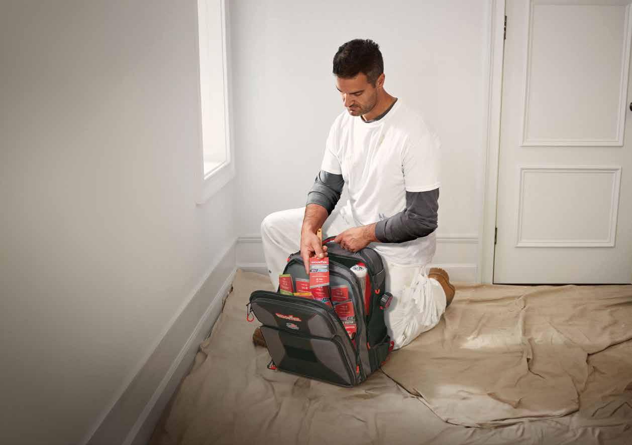 Wooster® Painter’s Backpack — painting tool organization meets convenient transportation. Built for the Pro and featuring multiple brush pockets, storage for roller frames & covers, and zippered compartments for prep tools, screwdrivers, or other accessories, this rugged backpack easily carries all your tools to the jobsite.