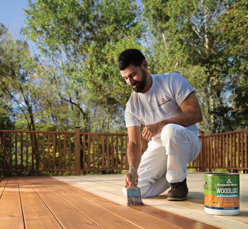 ©2024 Benjamin Moore & Co. Benjamin Moore, the triangle "M" symbol, and Woodluxe are registered trademarks licensed to Benjamin Moore & Co. 1/24 Color accuracy is ensured only when tinted in quality Benjamin Moore® paints and stains. Color representations may di er slightly from actual stain. Color: Teak ES-30 Translucent | Wood: Red Cedar See the Love