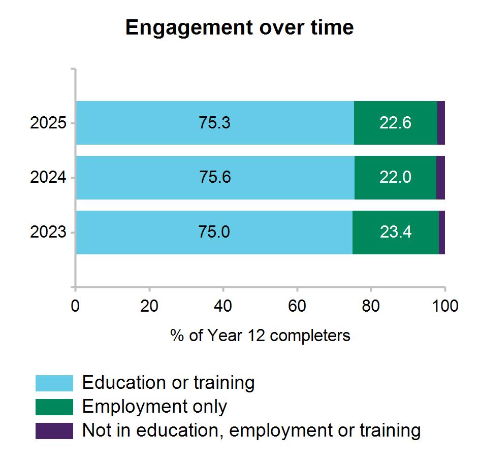 All Year 12 completers were assigned to a main destination. Respondents who were both studying and working are reported as being in education or training, including apprentices and trainees.