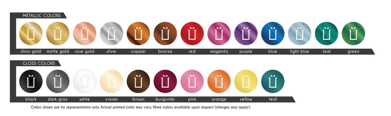 Imprinting on packaging items is available in standard pigment and metallic colors as a foil hotstamp.