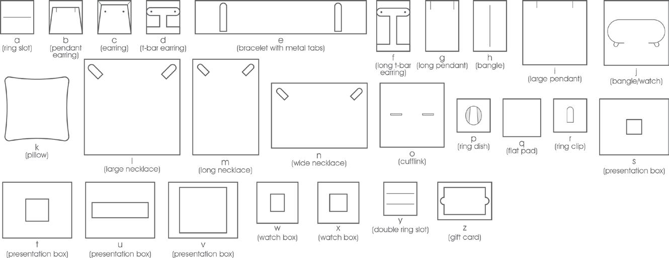 Letters below each insert drawing correspond to the type of insert found in the details of each box collection for a more clear representation of how the jewelry would be held in place.