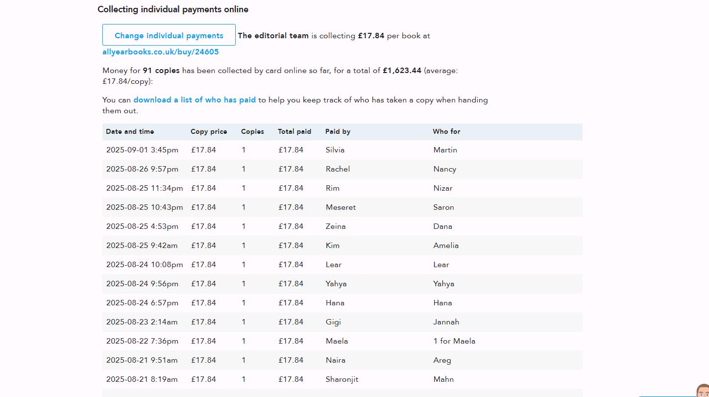 Our system collects a list of all the students that have paid, which you can download at the end of your project. This makes handing the yearbooks out a lot easier.