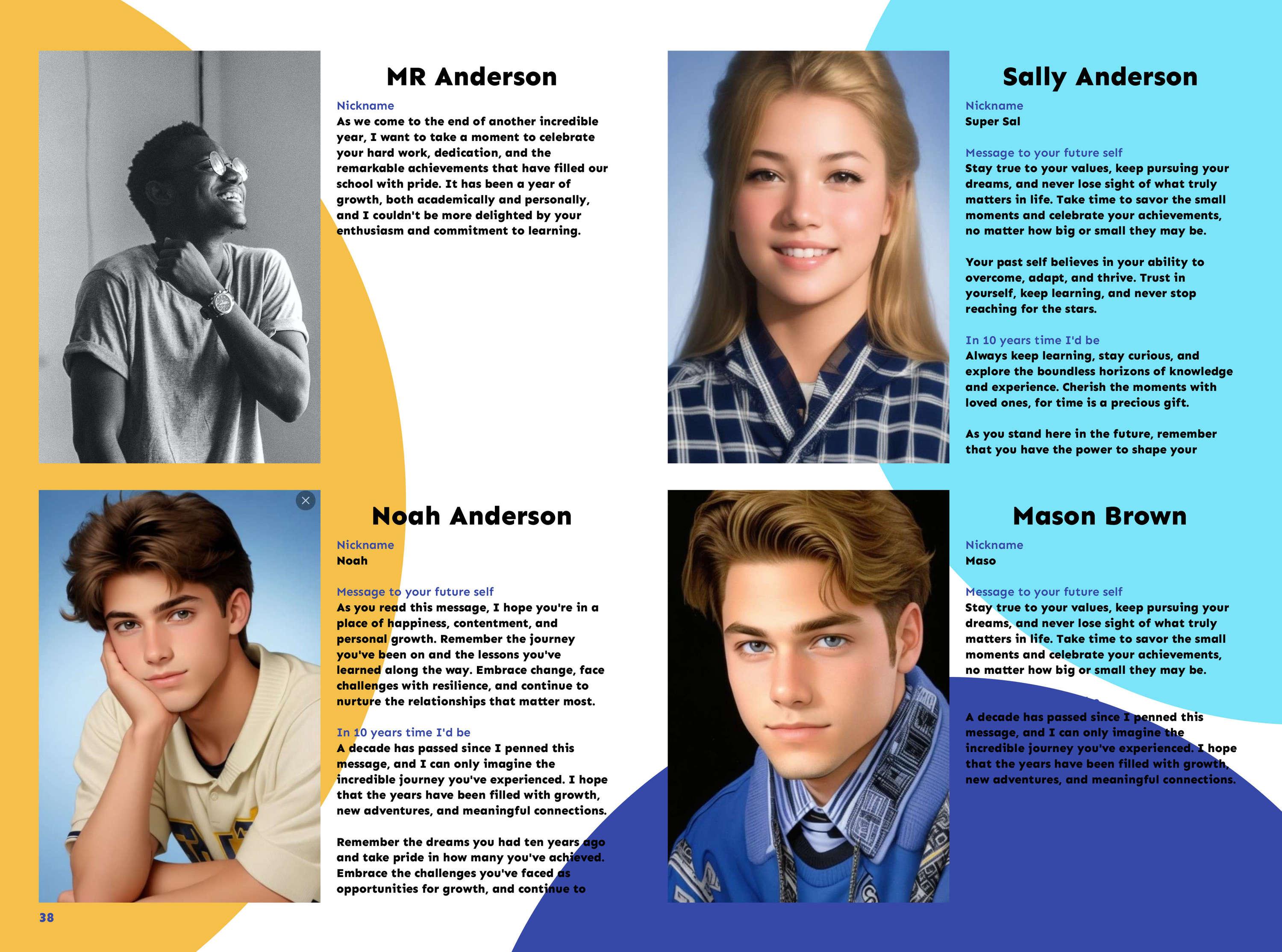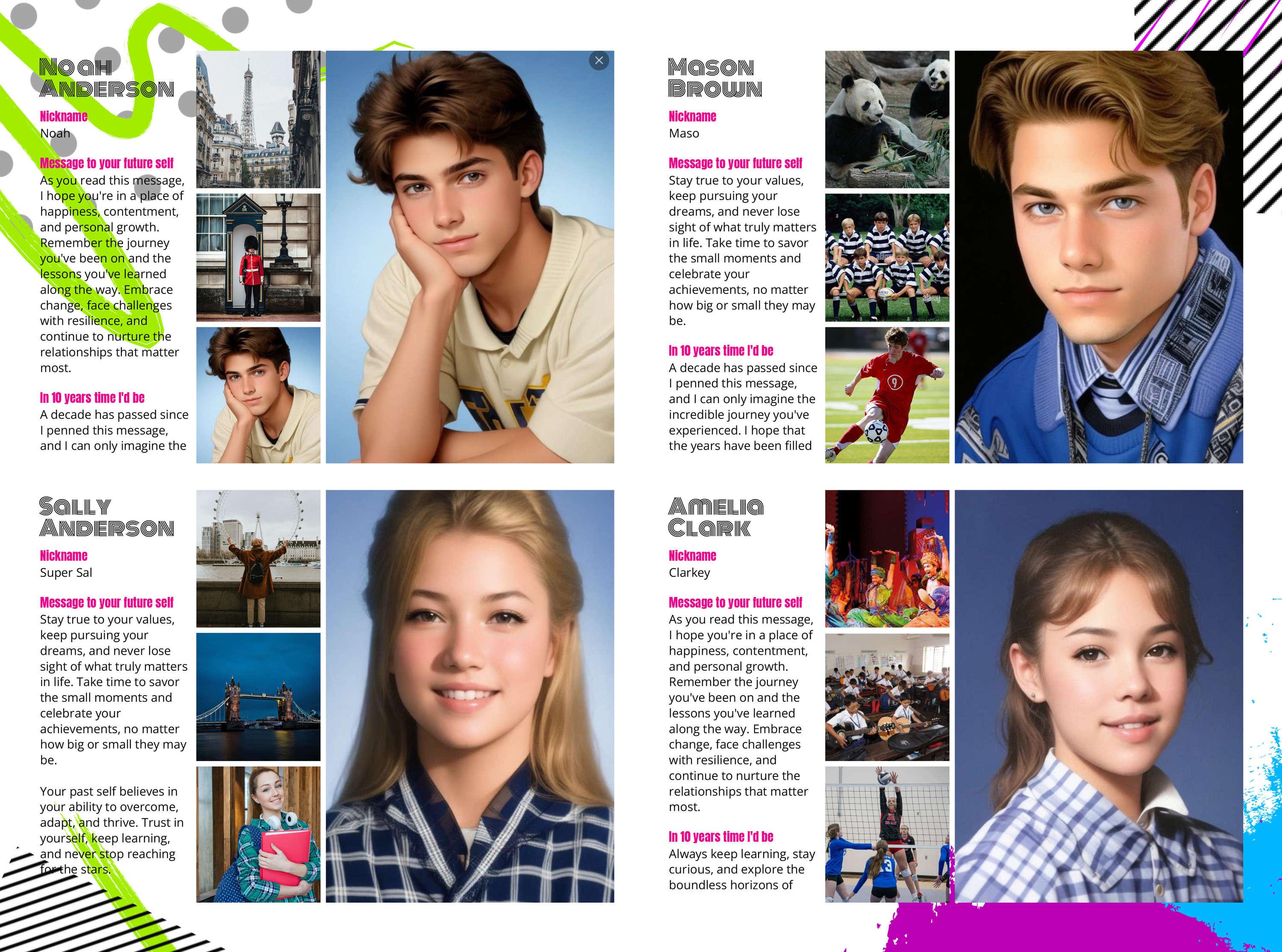 With a large selection of profile layouts to choose from, we'll have just the one you're looking for! Whether that be 1 student per double page spread or a spread to fit a whole class of 30. And the best part? They're all customisable, add your school colours and fun fonts with ease.