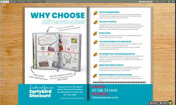 Style & Price to suit all www.allyearbooks.co.uk/privacy Professional printing and quality Online collaborative software Editors and Yearbook Committee Customer support How long does it take? Online shop As editors, you are in control of who has access to your book and you can set different access levels for your peace of mind. You can view all of our privacy information on GDPR at Our individual payments option makes it easy to set up a storefront to collect payments for your yearbook - we'll do the hard work so you don't have to. Made in the UK using the best quality paper. All of our books enjoy the same print and paper quality! Our team of yearbook experts are ready and waiting to help you bring your project to life! The team are on hand to help with design ideas, layout and anything you need to create your yearbook. You can speak to us via online chat, on the phone or via email - just give us a shout and we'll be happy to help! With our online cloud based software you can create your own pages or choose from our themes and templates. A free cover design service is also included! Get your yearbooks printed and delivered in around 2-3 weeks. Now that's a fast turnaround! www.allyearbooks.co.uk/prices Choose the style that suits you. check out our pricing calculator for an instant quote - yearbooks from £10.49