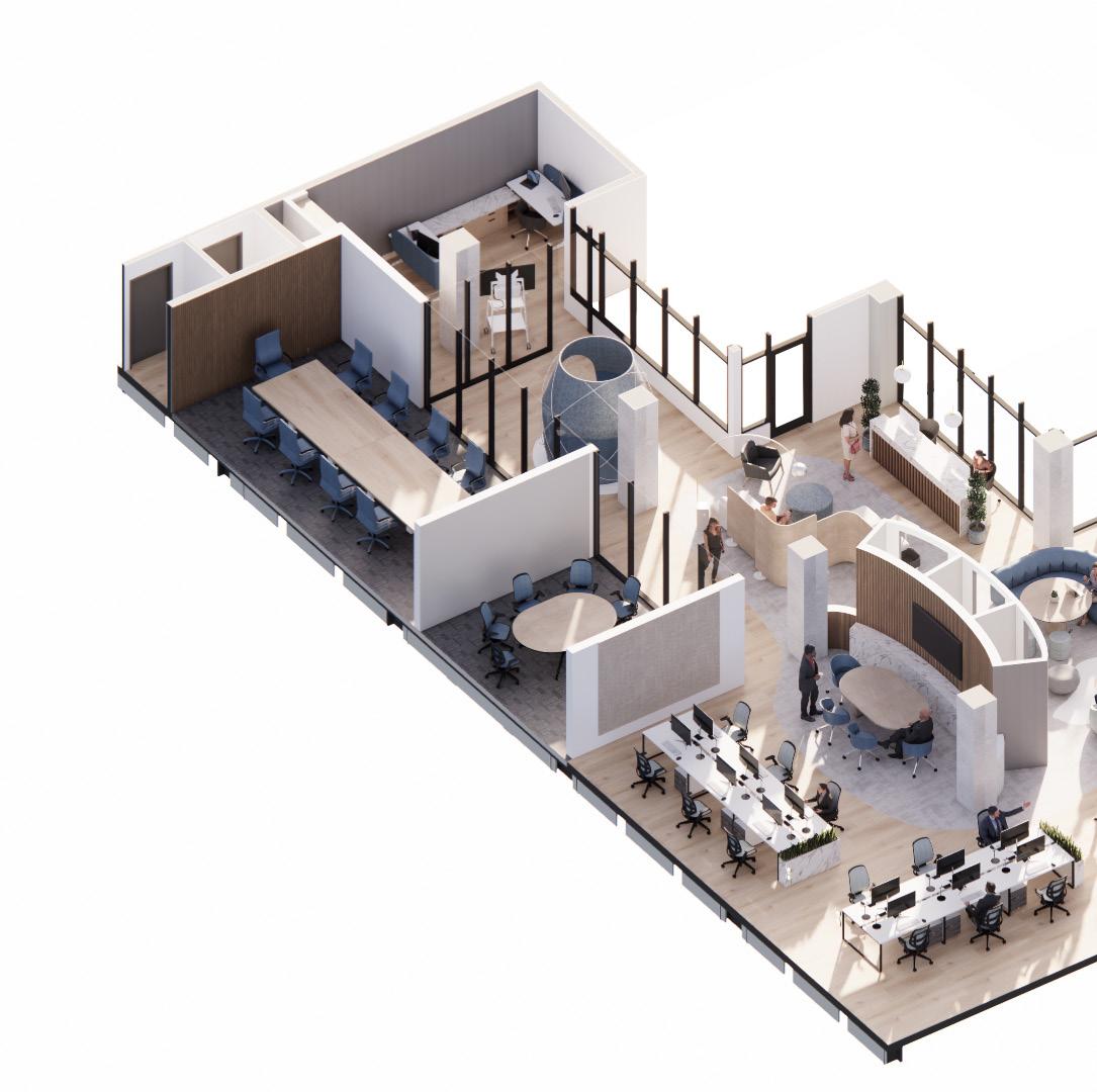 A workspace designed to provide an adaptable and inclusive office experience, catering to the needs of all employees and clients. With a variety of flexible and private workspaces, social gathering spots, and collaborative rooms, everyone can find a space that suits them perfectly.