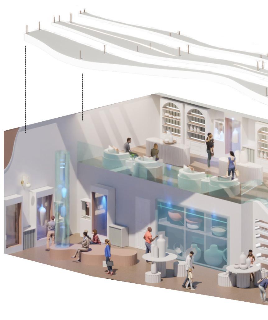Designing and branding for a futuristic boutique retail store where a virtual shopping experience converges with a traditional shopping experience in a truly visceral and immersive space. The proposed design will simultaneously occupy the physical reality of a street address while also occupying a cyber reality Where clay meets algorithms, a new era of pottery emerges. The pottery wheel converges with the network loop, providing an unimaginable set of inspirations to the timeless art. These vessels are receptable to stories, forms, and collected AI ideas.