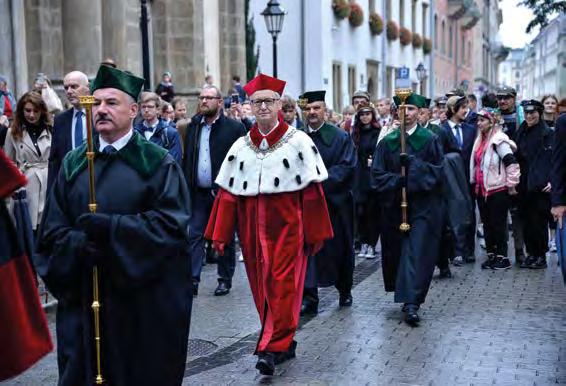 Główną część uroczystości poprzedziła msza święta odprawiona w kolegiacie św. Anny przez księdza prof. Tadeusza Panusia oraz pochód profesorów, który z Collegium Maius przeszedł Plantami przed Collegium Novum, a stamtąd ulicami miasta do Auditorium Maximum, gdzie po dwóch latach symbolicznych spotkań inauguracyjnych naznaczonych pandemią rozpoczęcie nowego roku akademickiego tym razem mogło świętować wyjątkowo liczne grono gości. Oprócz władz rektorskich i dziekańskich, członków Senatu UJ, przewodniczącego Rady Uczelni prof. Jacka Purchli, przewodniczących rad dyscyplin, dyrektorów szkół doktorskich, kanclerzy, kwestorów, studentów, doktorantów, przedstawicieli Stowarzyszenia Absolwentów Uniwersytetu Jagiellońskie go i pracowników administracji UJ wśród