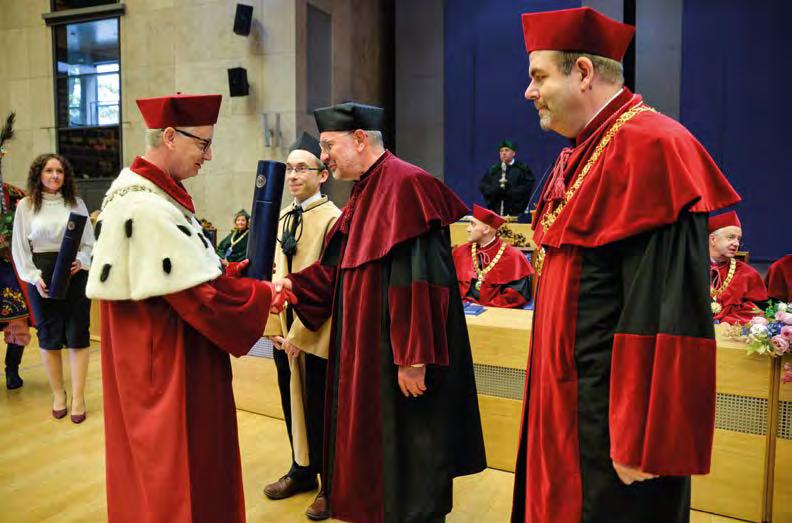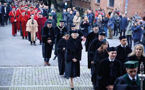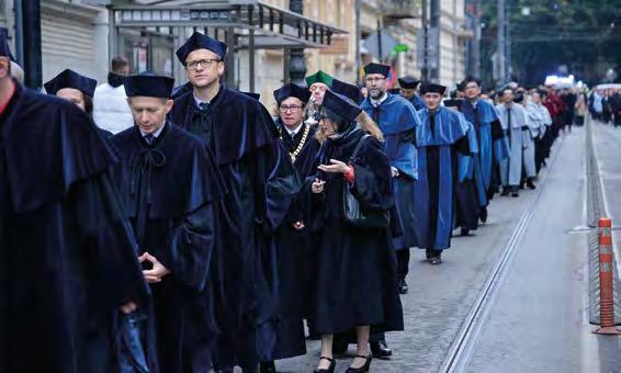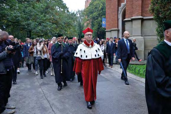 Każdy z nas ma świadomość niewiel kiego wpływu na globalne procesy. Ale to nie oznacza, że ma być bierny. Nie możemy się poddawać. Spróbujmy w otoczeniu, w którym codziennie funkcjonujemy, wpły nąć na świadomość w zakresie ochrony przyrody, na zmianę relacji międzyludz kich, choćby poprzez ograniczenie coraz częstszego, niezgodnego z jakimikolwiek zasadami, posługiwania się mediami społecznościowymi. Media odgrywają niezwykle ważną rolę w procesie komuni kacji, ale służą również do różnego rodzaju rozgrywek politycznych, instytucjonalnych, osobistych, częstokroć są także sposobem budowania swojego indywidualnego znaczenia, leczenia frustracji. Apeluję w dniu inauguracji roku akademickiego do pracowników, studentów, doktorantów, także naszych absolwentów: pamiętajcie o odpowiedzialności za słowo. Jeśli odczu wacie, że w jakiejkolwiek sferze naszego życia dzieją się rzeczy niegodne, proszę, zgłaszajcie te problemy, zanim staną się one nabrzmiałe i trudne do rozwiązania. Uwierzcie, że jako rektor nie pozostawię żadnej sprawy zgłoszonej do rektoratu bez rzetelnego rozpatrzenia. Jeśli jednak wspominam o odpowiedzialności za słowo, to dlatego, że wiem, że poprzez niespraw dzone zarzuty wypowiedziane w mediach społecznościowych, prasie, radiu, telewizji można skrzywdzić człowieka, wpłynąć na obniżenie autorytetu naszej Uczelni.