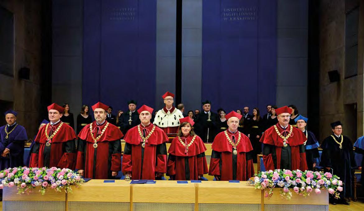 W dniu inauguracji warto również przypomnieć, że w ubiegłym roku akade mickim, oprócz problemów z pandemią i przeżyciami związanymi z wojną w Ukra inie, nasza Uczelnia zmagała się – po raz pierwszy od wielu lat – z poważnymi za grożeniami wywołanymi przez gwałtowne ulewy i podtopienia budynków, nie tylko na Kampusie, ale i w centrum (między innymi zalanie magazynów Biblioteki Jagielloń skiej). Dlatego rozpoczęliśmy bardzo kosz towne przygotowania do inwestycji zabez pieczenia budynków (Wydziału Biochemii, Biofizyki i Biotechnologii, Małopolskiego Centrum Biotechnologii, Wydziału Prawa i Administracji, Wydziału Studiów Mię dzynarodowych i Politycznych) zaporami przeciwzalewowymi.