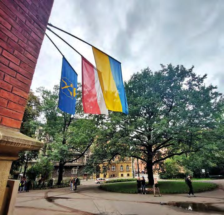 Po tych dwóch latach, kiedy odno siliśmy już wrażenie, że świat powróci do w miarę „normalnego” funkcjonowa nia, prawdziwym wstrząsem był dzień 24 lutego 2022 – agresja zbrojna Rosji na Ukrainę. Do tego dnia żyliśmy w przeko naniu, że w XXI wieku w tej części świata tragedia wojenna jest niemożliwa. Świat nas po raz kolejny ogromnie zaskoczył i obalił wszystkie pewniki, którymi w sa mozadowoleniu żyli i politycy, i zwykli mieszkańcy. Zarówno w pierwszych dniach od wybuchu wojny, jak i w kolej nych miesiącach wspólnota akademicka Uniwersytetu Jagiellońskiego w różnych formach wyraziła solidarność z c ałym narodem ukraińskim. W budynkach nale żących do Uniwersytetu przyjęto łącznie ponad 700 osób, z czego 502 przebywały w nich przez pół roku. Po 31 sierpnia 2022 w naszych akademikach nadal pozostało jeszcze 335 uchodźców. Kwestia długości ich zakwaterowania jest uzależniona od tego, jakie będą dalsze decyzje Małopol skiego Urzędu Wojewódzkiego. Uczelnia zorganizowała dla studentów, doktorantów i pracowników oraz zakwaterowanych na terenie UJ uchodźców z Ukrainy (głównie matki z dziećmi), między innymi, wsparcie
