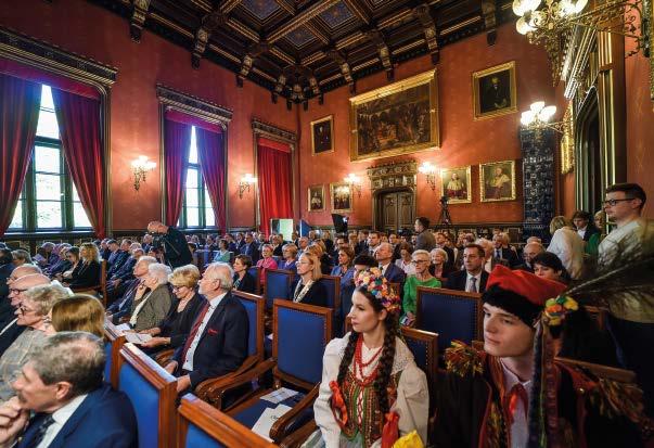 Główna część uroczystości, zorganizowana w auli Collegium Novum, jak co roku, zgromadziła liczne grono gości i przyjaciół Uniwersytetu. Przybyli na nią przedstawiciele władz miasta i regionu, korpusu konsularnego, rektorzy i prorektorzy krakowskich uczelni, reprezentanci świata nauki oraz kultury i sztuki, rektorzy UJ poprzednich kadencji: prof. Wojciech Nowak i prof. Karol Musioł, a także prorektorzy,