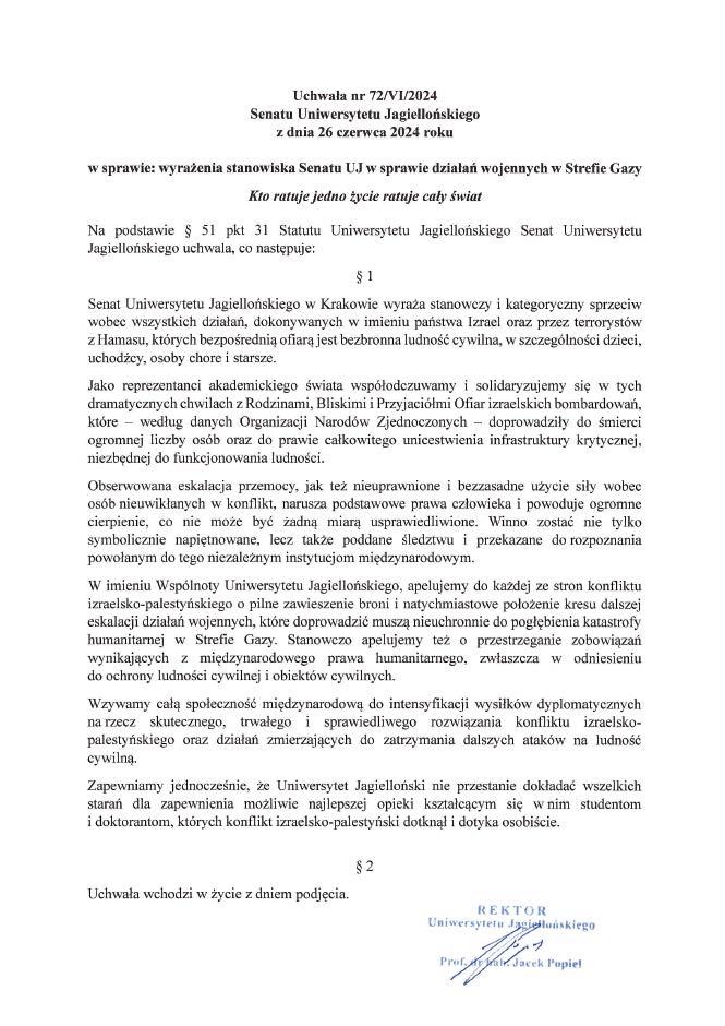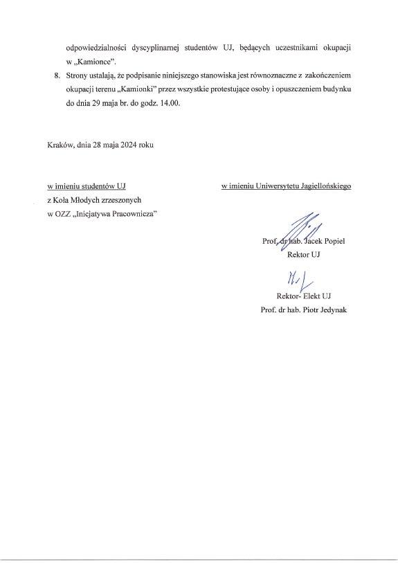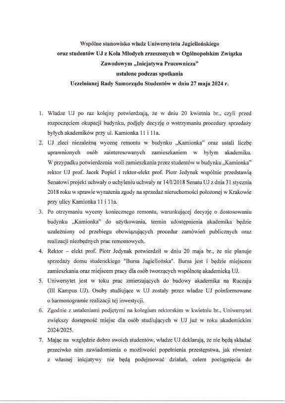 Podczas nadzwyczajnego posiedzenia Senat UJ wyraził pełne poparcie dla działań podejmowanych przez rektora UJ oraz władze uczelni w związku z bezprawnym zajęciem budynku przy ul. Kamionka 11 w Krakowie i wezwał osoby tam przebywające do jego opuszczenia.