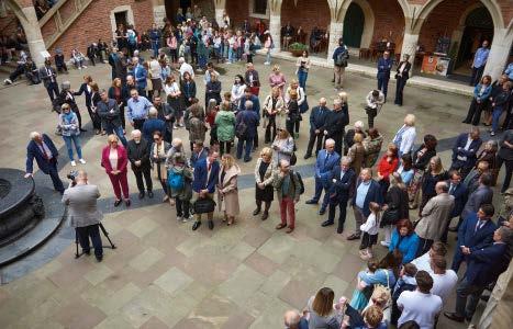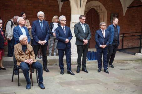 Uczestnicy uroczystości odsłonięcia tablicy upamiętniającej prof. Franciszka Ziejkę, rektora UJ w latach 1999–2005; Auditorium Maximum UJ, 10 maja 2024