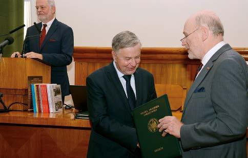 przyjaciół spełniła w wielkim stopniu „Solidarność” – mówił. Dodał, że od lat 50. XX wieku ich myśli skupione były na tym, jak w wolnej Polsce ma wyglądać trójpodział władzy i kształt sądownictwa. – Prawo musi odpowiadać kategoriom moralnym, nie wolno działać wbrew podstawowym prawom obywatelskim i prawom człowieka. Obecne czasy są trudne dla prawnika. Musimy się wszyscy wykazać wielką cierpliwością, wielką rozwagą, aby nie powoływać się na precedens, choćby służył najlepszej sprawie. Szukacie we mnie tych wartości, które znajduję w sobie w małym stopniu. Szukajcie tych wartości wśród prawników i sędziów, moich kolegów i przyjaciół, tych, którzy ponieśli prawdziwe konsekwencje – podkreślił Profesor. Jako pierwszy gratulacje bohaterowi uroczystości złożył rektor UJ prof. Jacek Popiel. W imieniu całej społeczności akademickiej Uniwersytetu podziękował Profesorowi za zaszczycenie nas swoją obecnością. Przekazał, że wszyscy jeste-