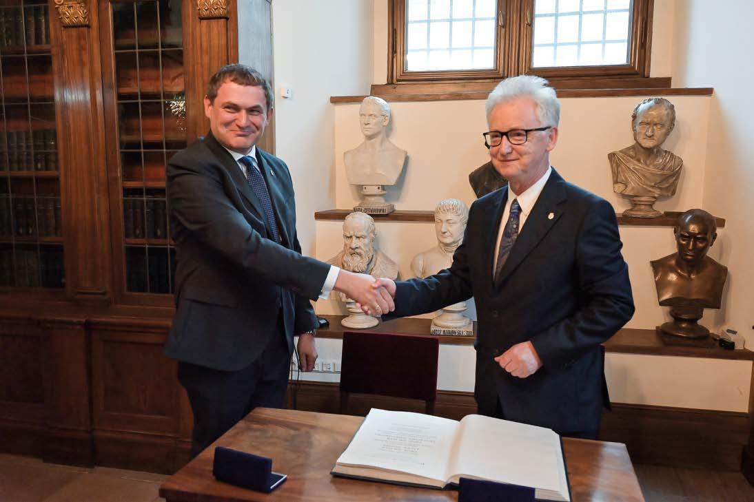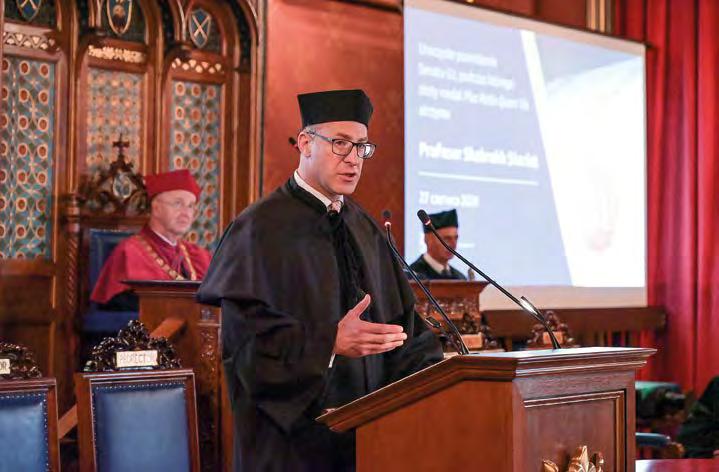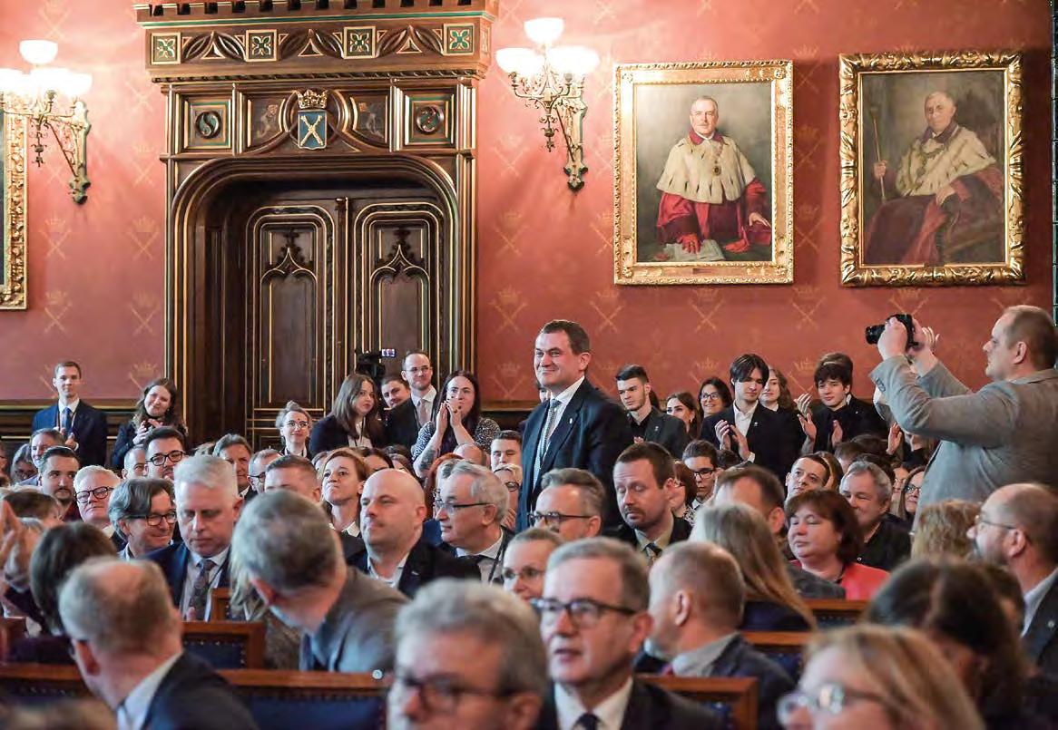 Przejmujący władzę rektorską prof. Piotr Jedynak, wspominając ostatnie cztery lata, dodał, że Uniwersytet musiał stawić czoło nie tylko efektom pandemii i wojny za wschodnią granicą, ale także nieprzychylnemu otoczeniu politycznemu i pra wnemu oraz akcjom grup społecznych, z którymi w poprzednich kadencjach się nie konfrontował.