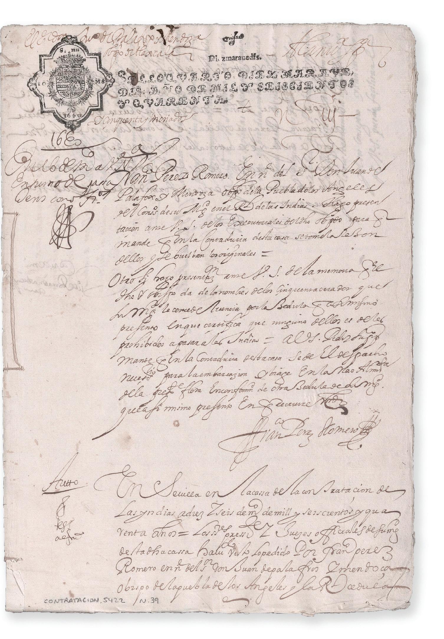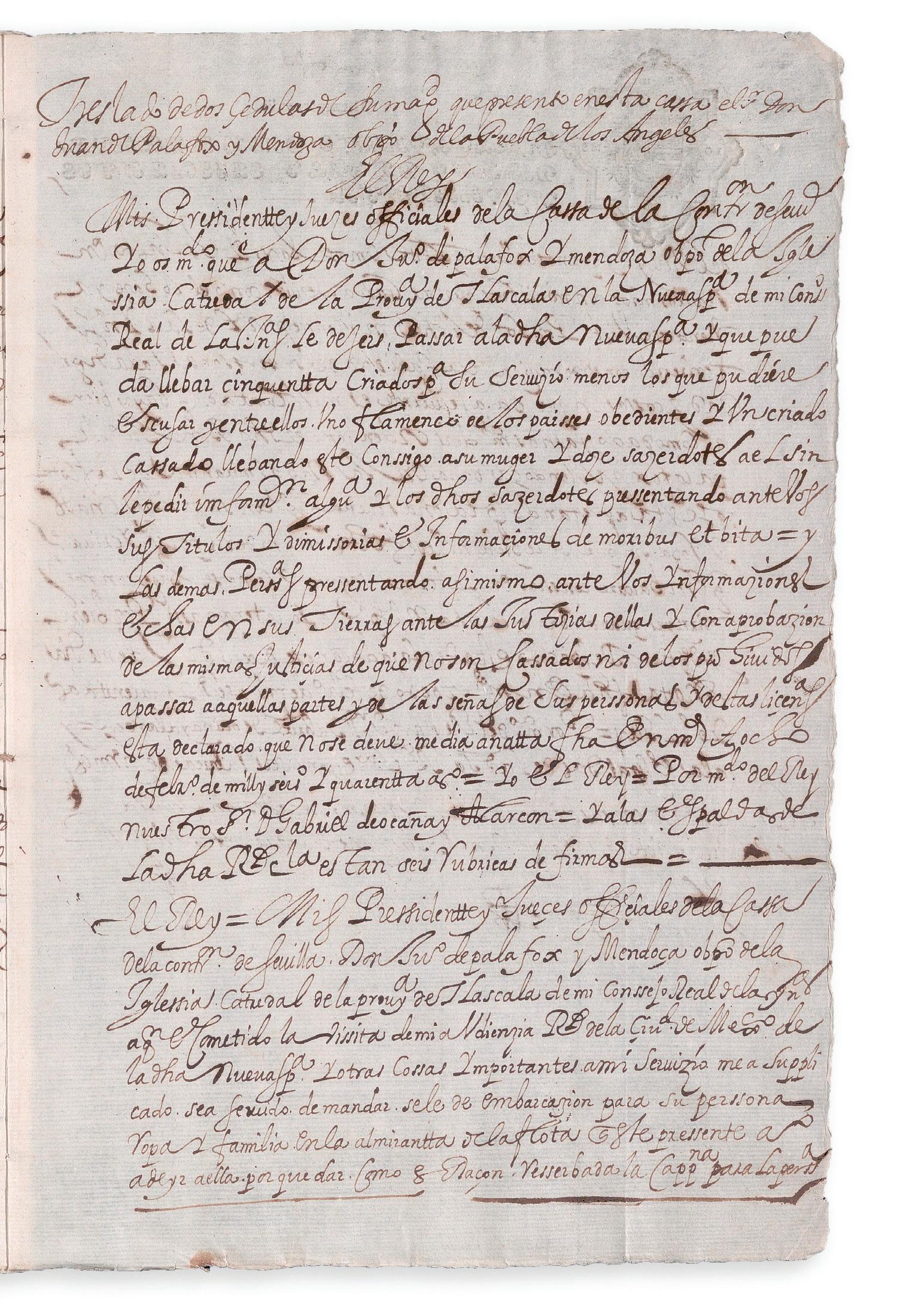 El documento da cuenta de una autorización concedida a Palafox que oficializa su traslado desde Castilla, nombrado obispo de Puebla por el rey Felipe IV. Palafox llega a Nueva España como visitador real para atender problemas de jurisdicciones reales y eclesiásticas, corrupción en las instancias de poder, comisión a los mandatos de la Corona y las confrontaciones entre jesuitas y franciscanos con el poder central virreinal, además de la escasez de recursos económicos o pérdida de los mismos. Palafox da cuenta de todas estas cuestiones a través de informes al Consejo de Indias y cartas con el rey. Palafox es un exponente de la política regalista de Felipe IV. También se registran los nombres de las personas que acompañan a Palafox (su séquito) y fungirán como sus ayudantes una vez que tome posesión formal de la diócesis poblana.