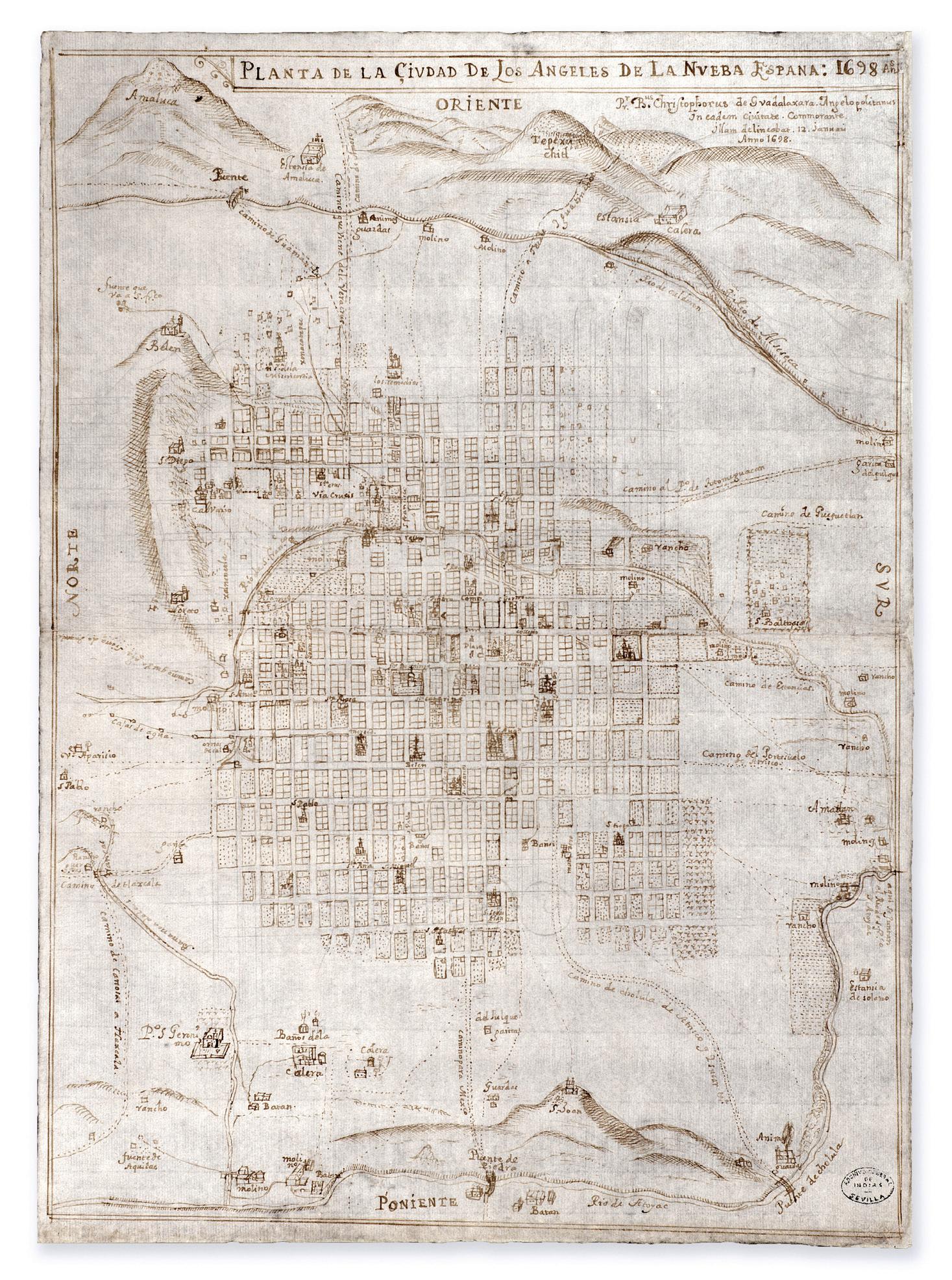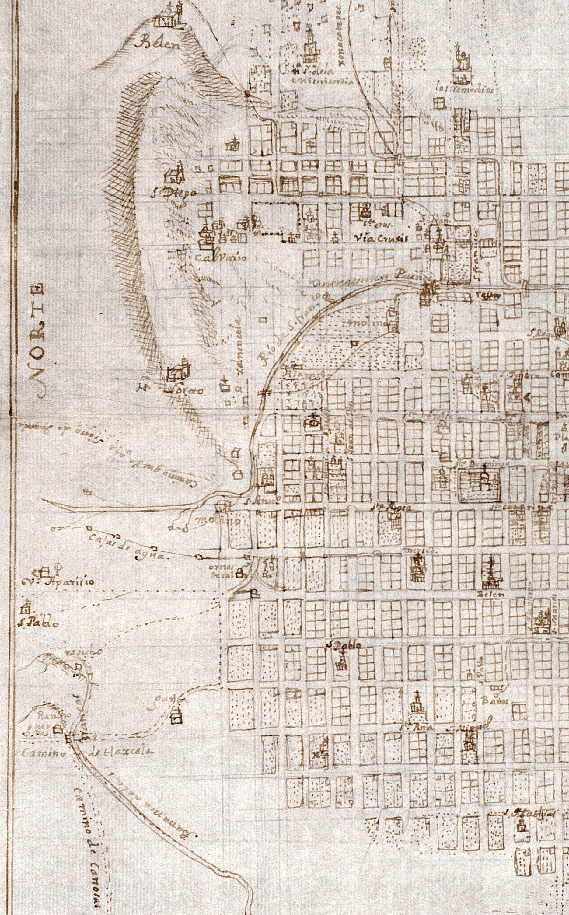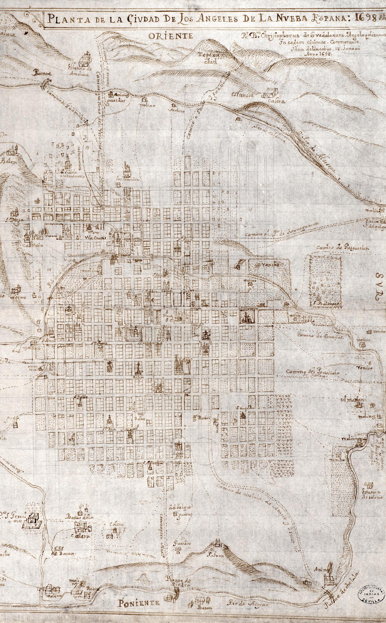 El listado de vecinos de Puebla de los Ángeles data de 1532, documento que junto al acuerdo para colocar la primera piedra del templo principal, de 1536, confirman que el primer ensayo de una ciudad de castellanos había prosperado. Ambos documentos encabezan las obras que integran este núcleo. También se incluye el acuerdo para erigir la nueva catedral, edificio de gran importancia para comprender la planeación de la ciudad naciente, ya que de él arranca la red cuadriculada de calles que organiza el espacio y el crecimiento de Puebla, desde entonces y hasta la actualidad. La planta urbana de 1698, elaborada por el bachiller Cristóbal de Guadalajara, representa una vista a vuelo de pájaro de la ciudad, donde se aprecia la traza reticular y numerosos edificios, plazas y barrios que siguen siendo emblemas de la ciudad.
