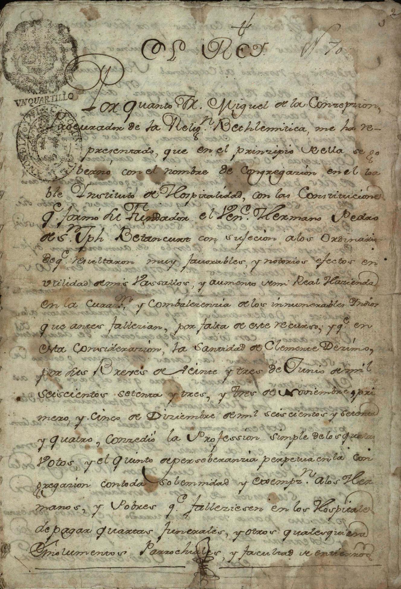 Real cédula sobre las constituciones y obligaciones de la religión betlemítica, para la fundación del hospital