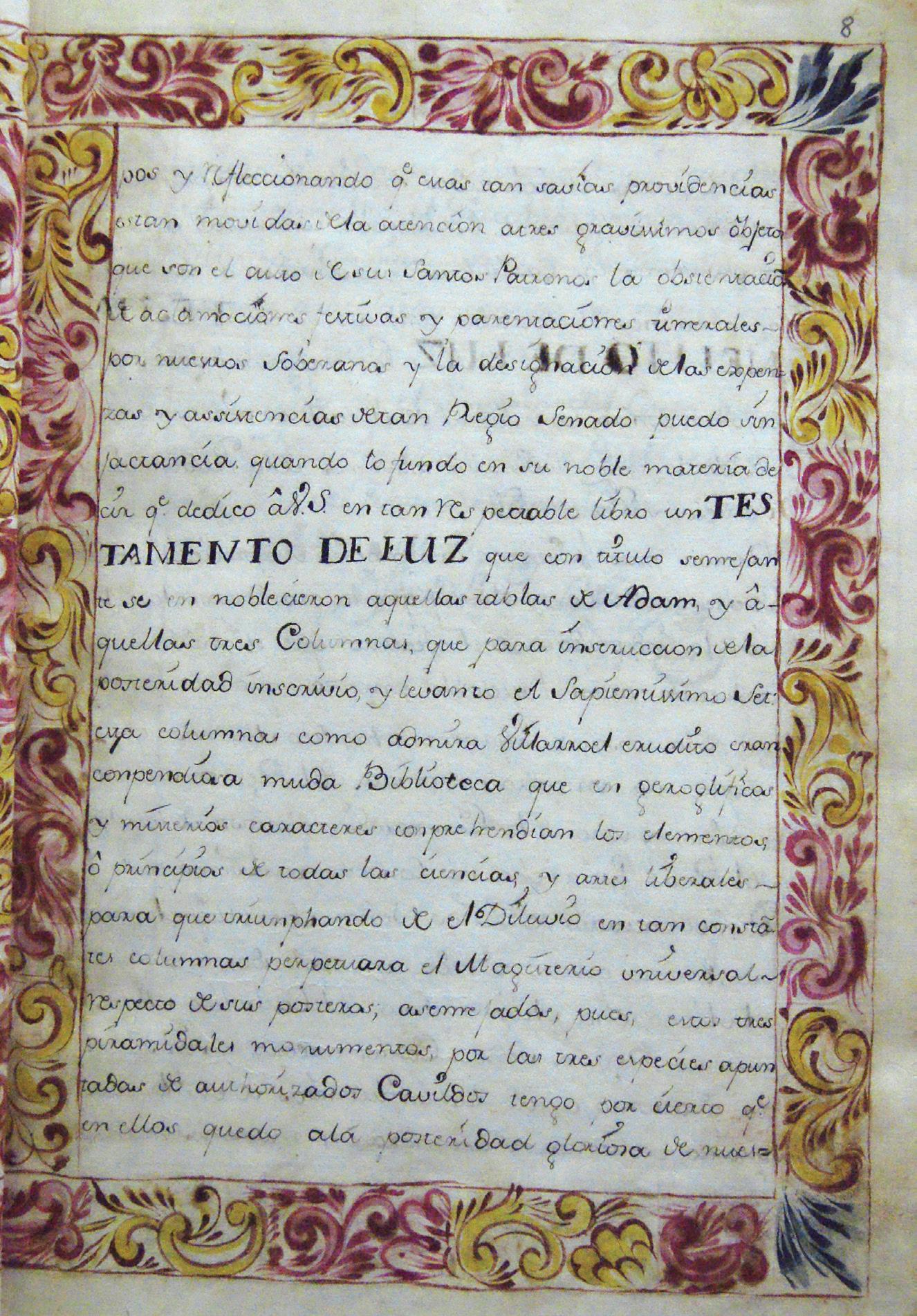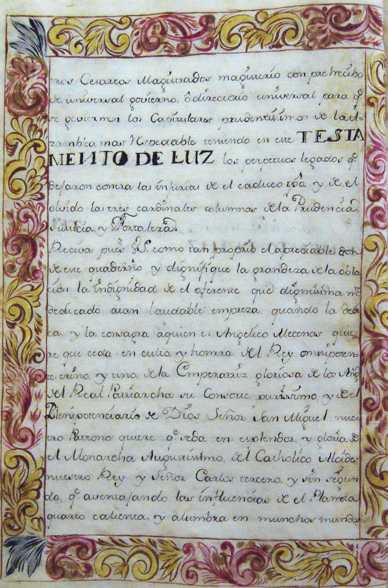Las cinco páginas que se exhiben tratan de la carta escrita y firmada por Arteaga y Solórzano. Tiene metáforas donde el rey Carlos III aparece representado como el “sol”, ya que los dominios de la monarquía española se extendían por Europa, América y Asia. Carlos III envió a Nueva España a José de Gálvez como visitador para supervisar a los ayuntamientos y la recaudación de impuestos. Este libro de patronatos incluye las transcripciones a petición del visitador Gálvez. Para 1769, resultaba incomprensible la letra del siglo XVI, una razón más que motivó dicha transcripción.
