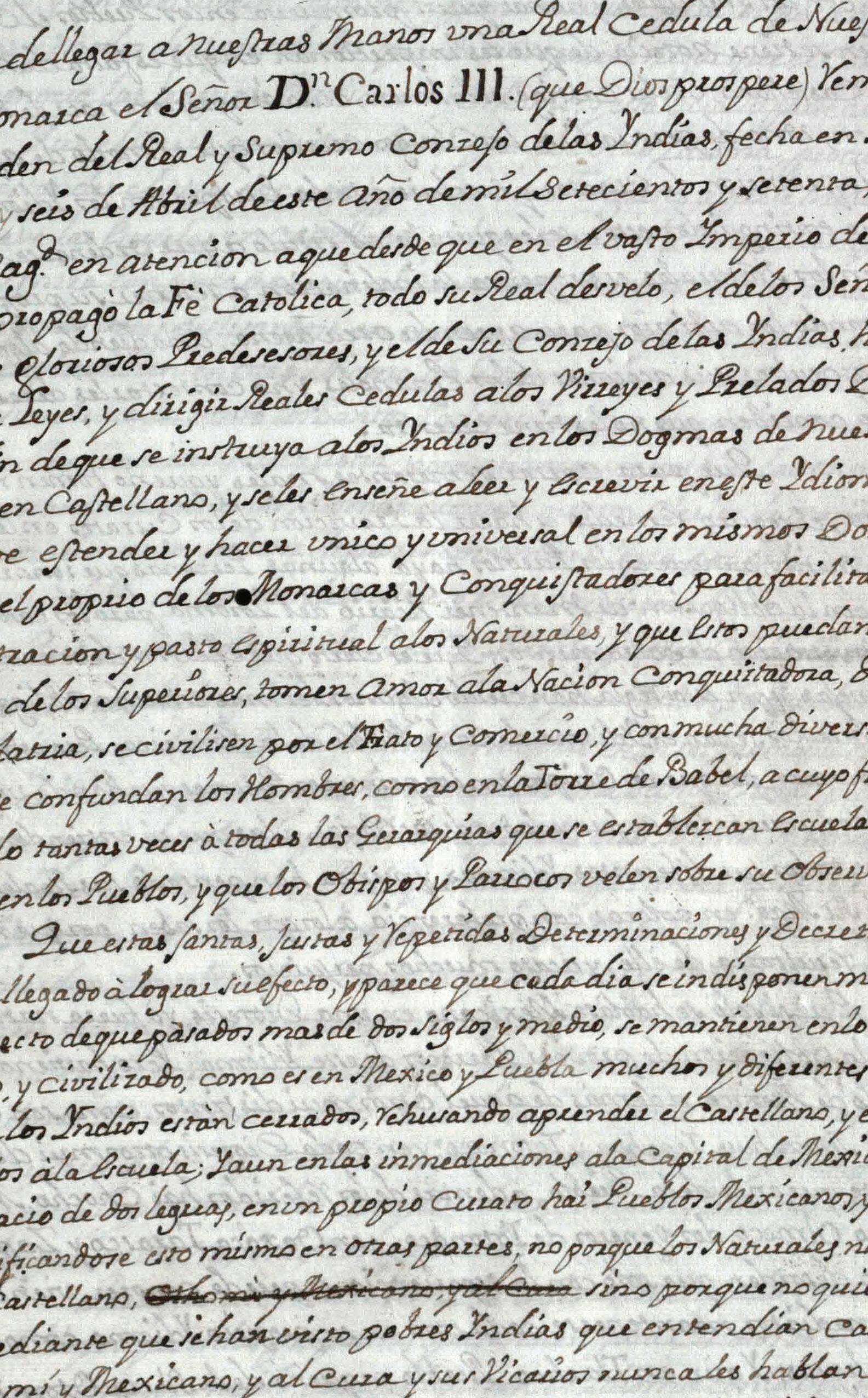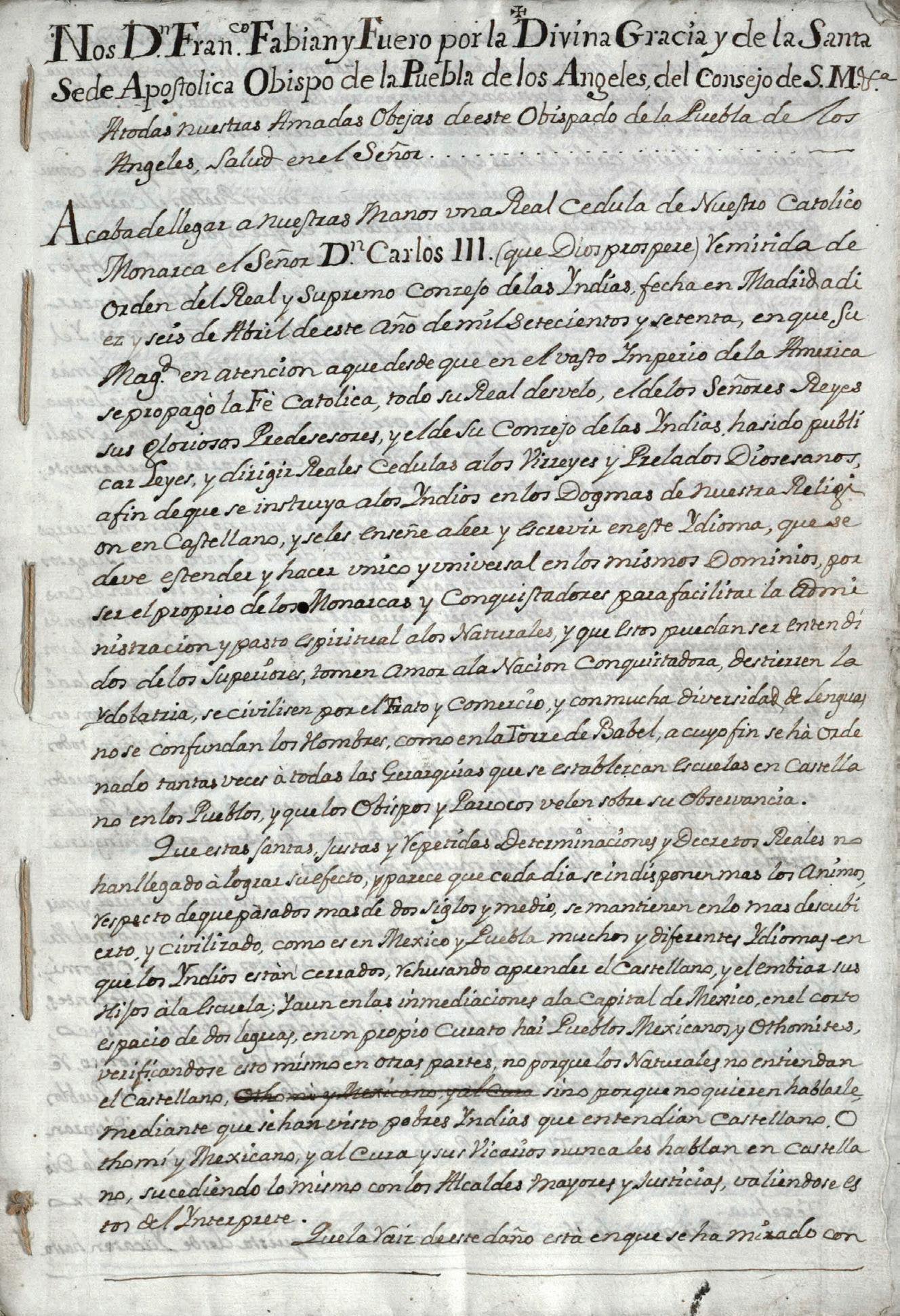 Carlos III homologó el castellano como lengua hegemónica en todos los territorios hispánicos. En 1768 expidió una real cédula en la que decretó la obligatoriedad del castellano para documentos oficiales, procesos judiciales, enseñanza básica e instrucción cristiana. El Archivo Diocesano de Puebla conserva un manuscrito de 1770 en el que el obispo Francisco Fabián y Fuero transmitió esta instrucción a los clérigos encargados de predicar en castellano.