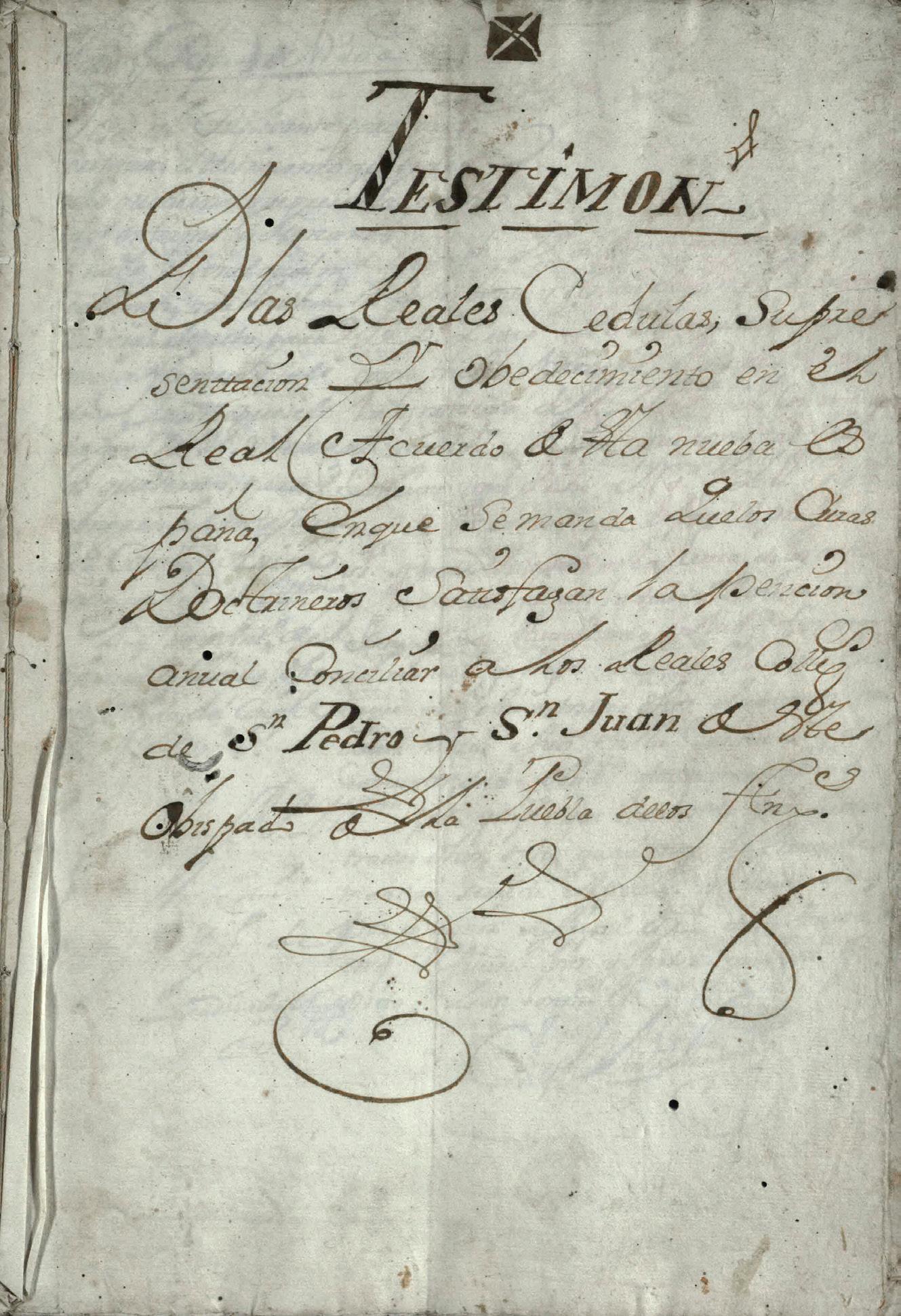 Testimonio de las reales cédulas en que se manda a los curas doctrineros que satisfagan la pensión anual conciliar a los reales colegios de San Pedro y San Juan