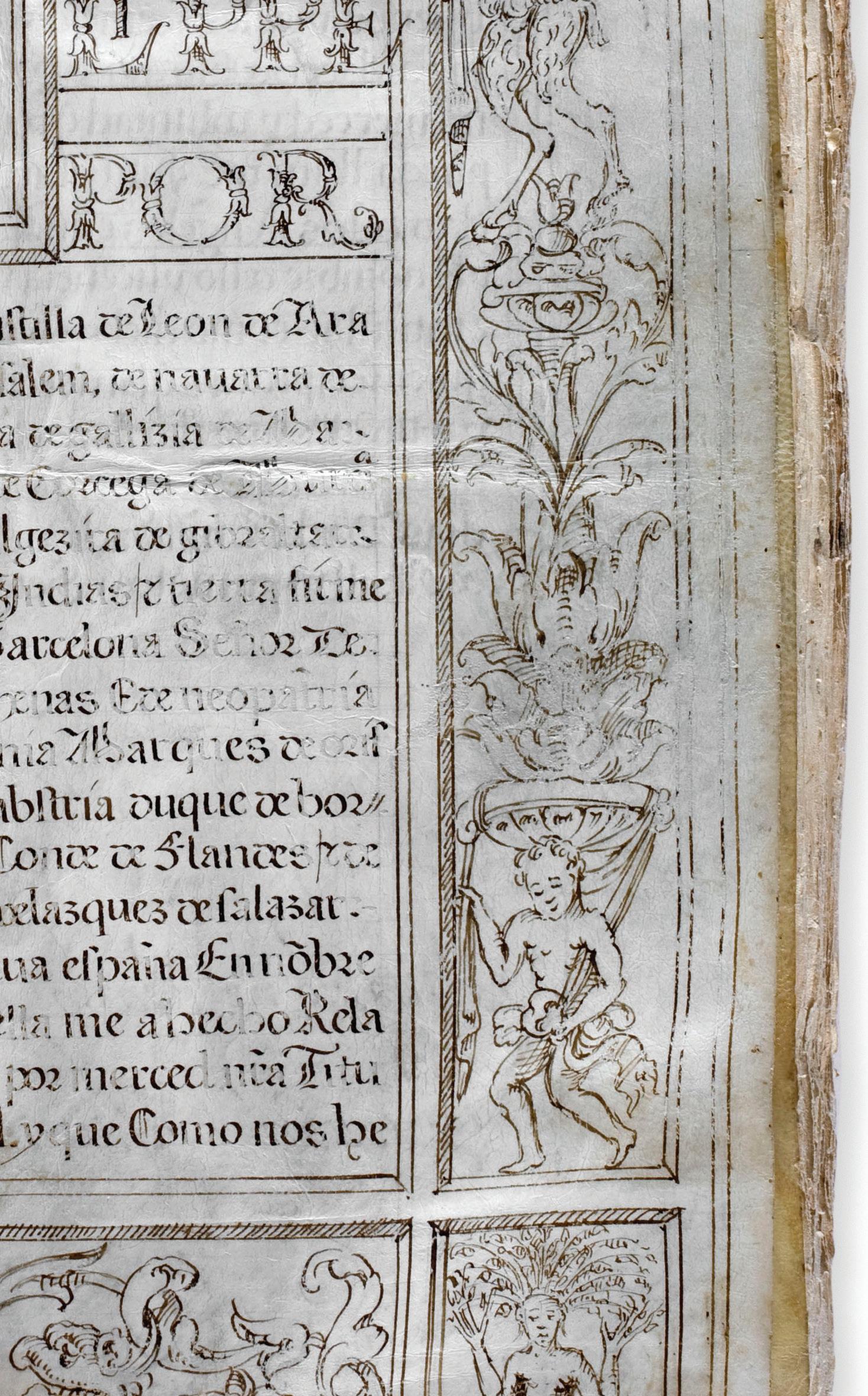 El documento luce una letra capitular que introduce el nombre del rey “Don Felipe”, en cuyo centro fue representado el escudo de Puebla. Los marcos fueron decorados con grutescos, ornamentos renacentistas que integran hojas de acanto, lacerías, mascarones, sátiros y candeleros antiguos.