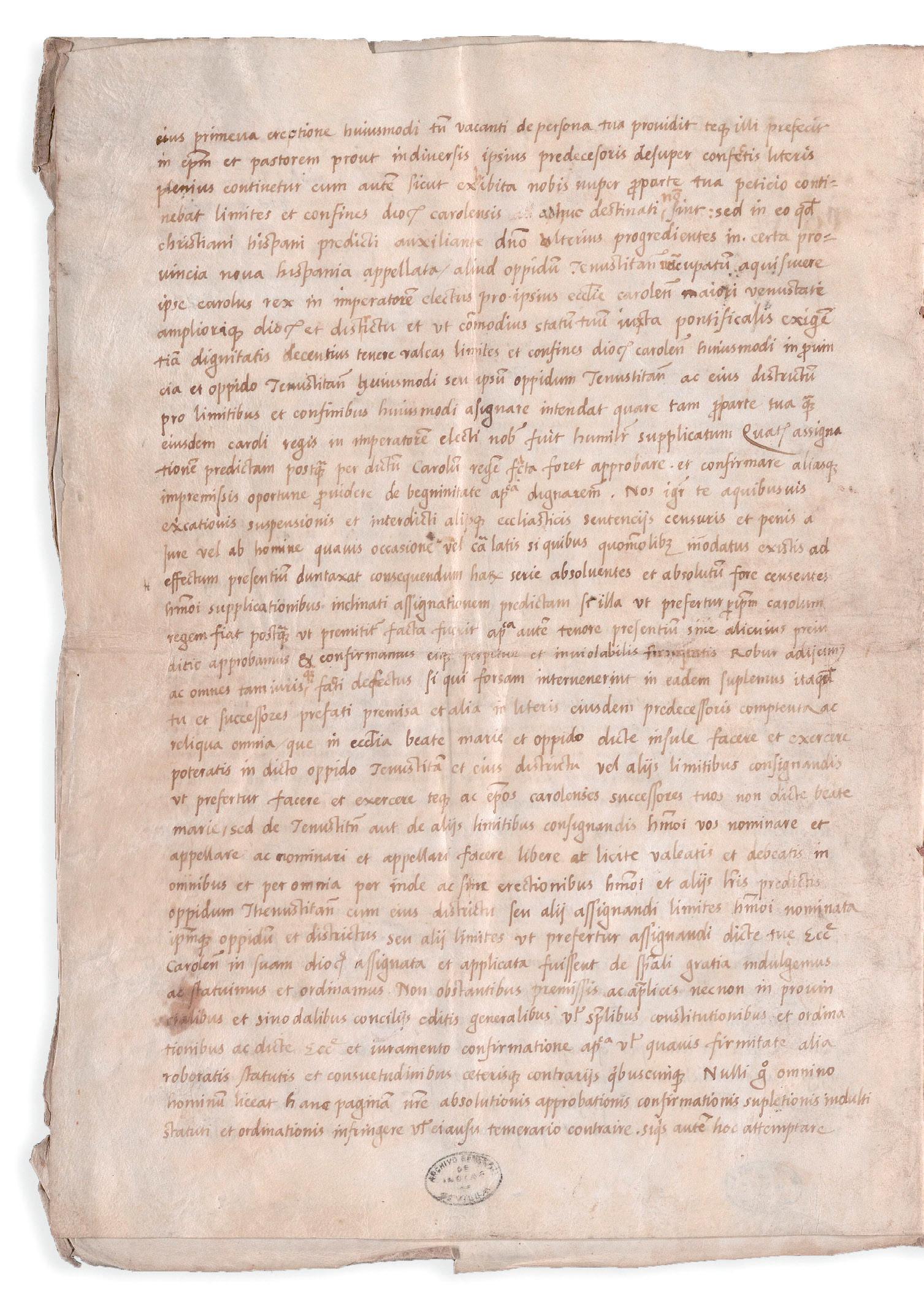 Testimonio suscrito por el notario apostólico Cristóbal Peregrina de la erección de la iglesia y obispado de Puebla de los Ángeles (Tlaxcala) por Julián Garcés (OP), en el que se incluyen bulas de León X del 24 de enero de 1519 y Clemente VII del 13 de octubre de 1525