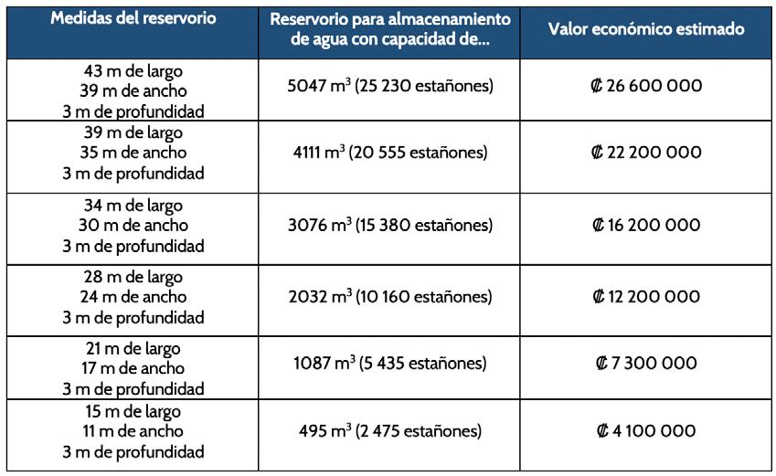 Cuadro 1. Estimación económica de inversión dependiendo de las dimensiones de los reservorios de agua (mayo 2023).