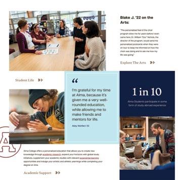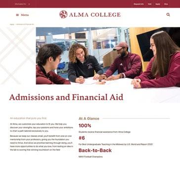 The college partnered with Ologie, an Ohio-based advertising agency, to help coordinate the refresh effort, and used extensive market research with all of Alma’s audiences to inform its efforts. A team of staff, students and faculty from across multiple disciplines served on an advisory committee to oversee the project, which took roughly 18 months from start to finish.