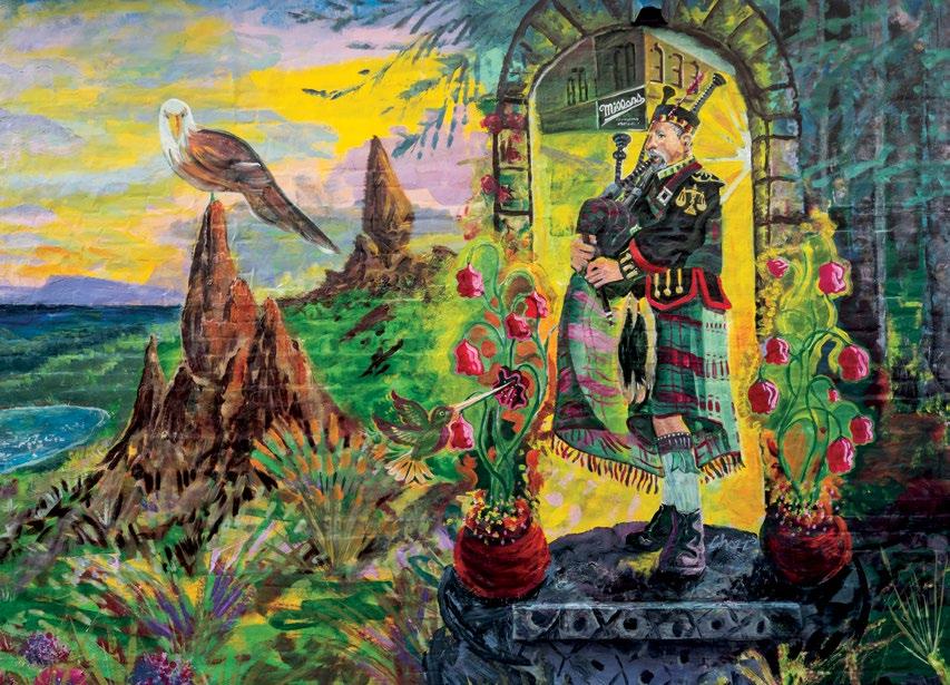 An Alma native, Stephen Meyer was originally put in contact with Miller by Amy (Edgar) Wellington ’87, a friend who also grew up in Alma and has worked in the art scenes of Lansing and Detroit for many years. The initial sketch from which the mural evolved was drafted by Meyer’s sister, Doris Balgoyen ’72. Ultimately worked into the design are a few images that are an homage to Meyer’s parents — the late Stephen and Helen Meyer, both of whom are integral parts of the history of Alma College and the city of Alma — and reflect the family’s interests and relationship to the city.