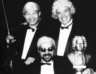 Below, clockwise: Will Nichols, at right, is pictured with Wei Tsun Chang and Anthony Patterson, promoting the concert "Basically Bach," in 1996. Nichols is pictured at his final performance leading the Alma College Choirs, the 2023 Festival of Carols. Nichols is pictured with Brendan Lodge following commencement in 2014.