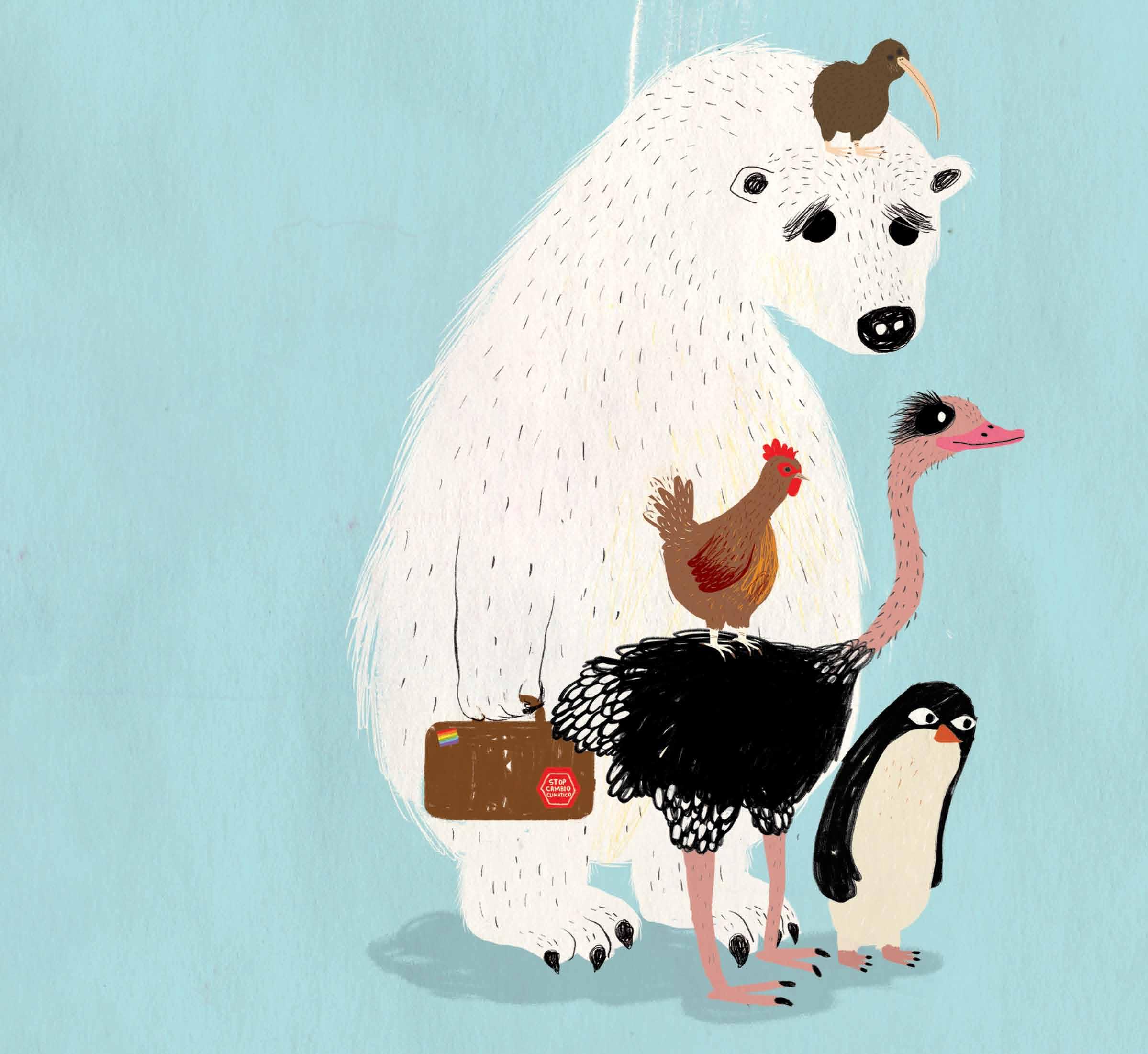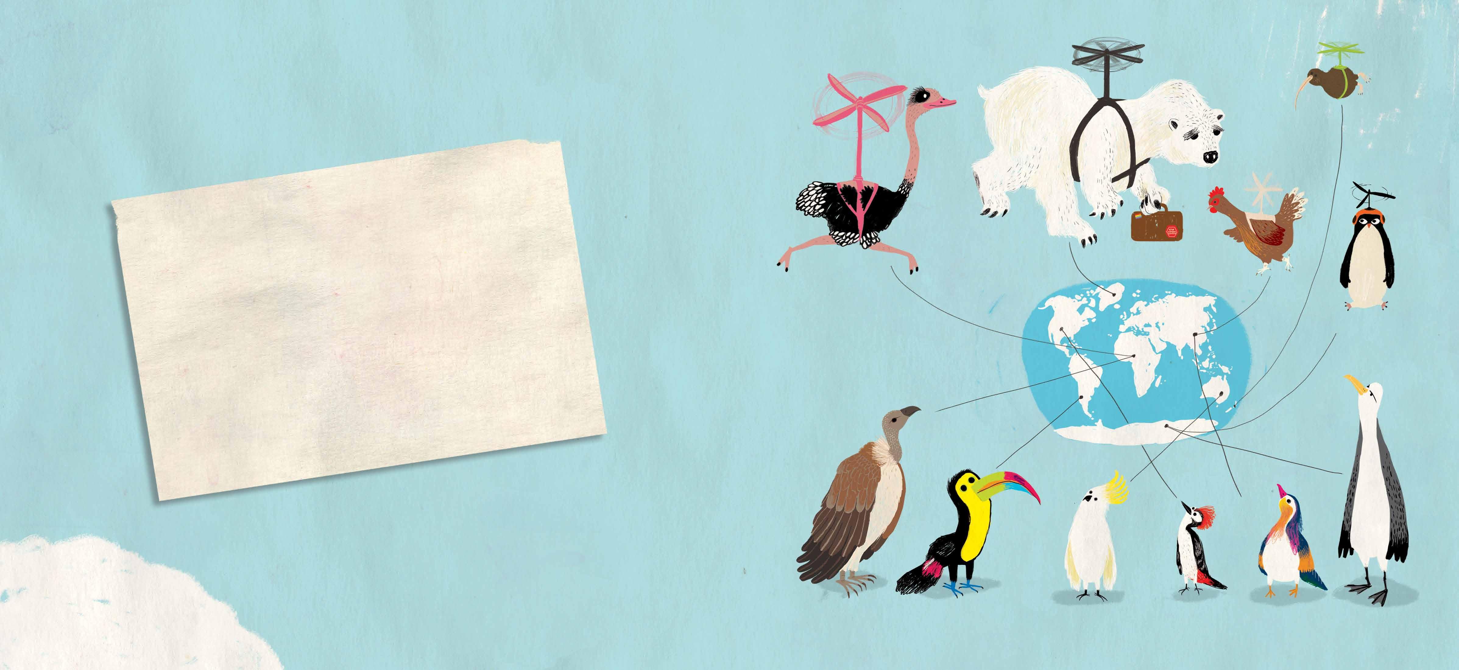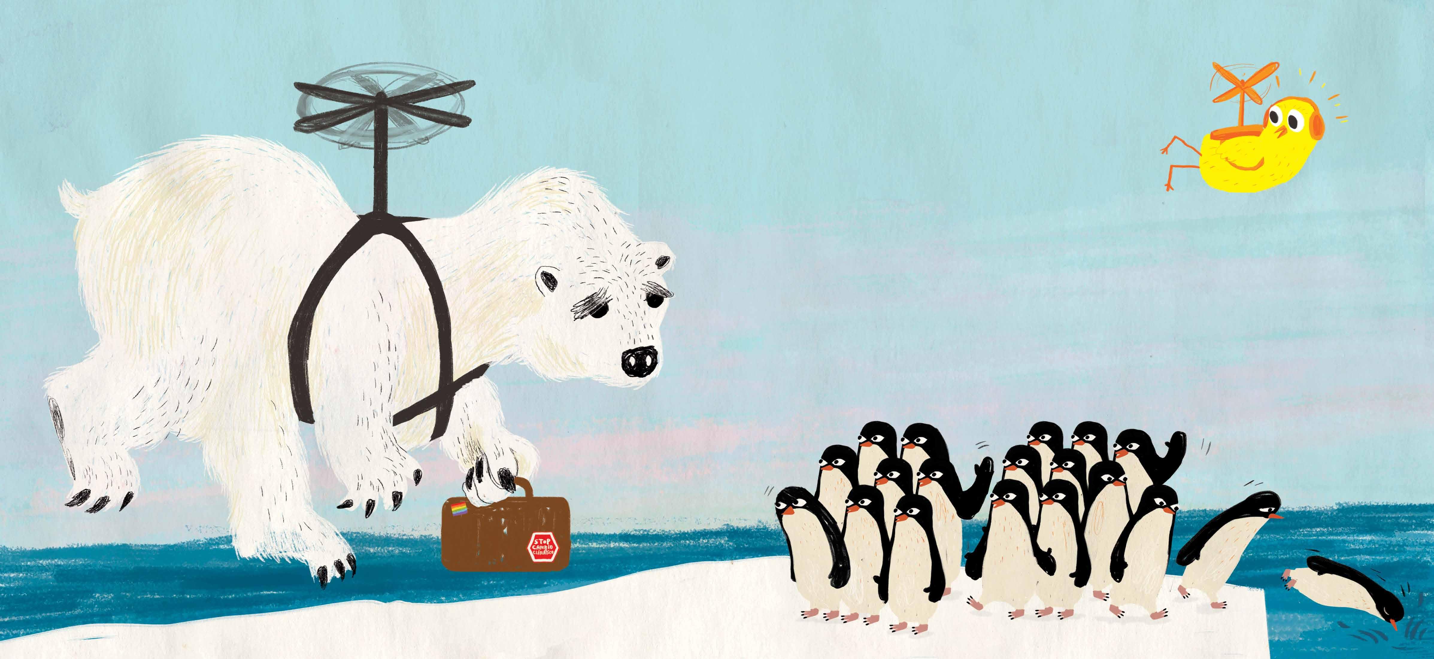 Querido Teo: Gracias a nuestro invento he podido viajar por todo el mundo. Ahora vivo en un lugar muy bonito donde disfruto mucho con mis nuevas amigas y amigos. Compartir nuestro invento ha sido muy útil. Tras adaptarlo Avestruz pudo cumplir su sueño, Gallina se liberó y Kiwi descubrió lugares diferentes. Pingüino lo compartió con Osa Polar para ayudarla a encontrar un nuevo hogar. Espero que vengas pronto a visitarnos. Te quiere. Tu amigo Pájaro Amarillo.
