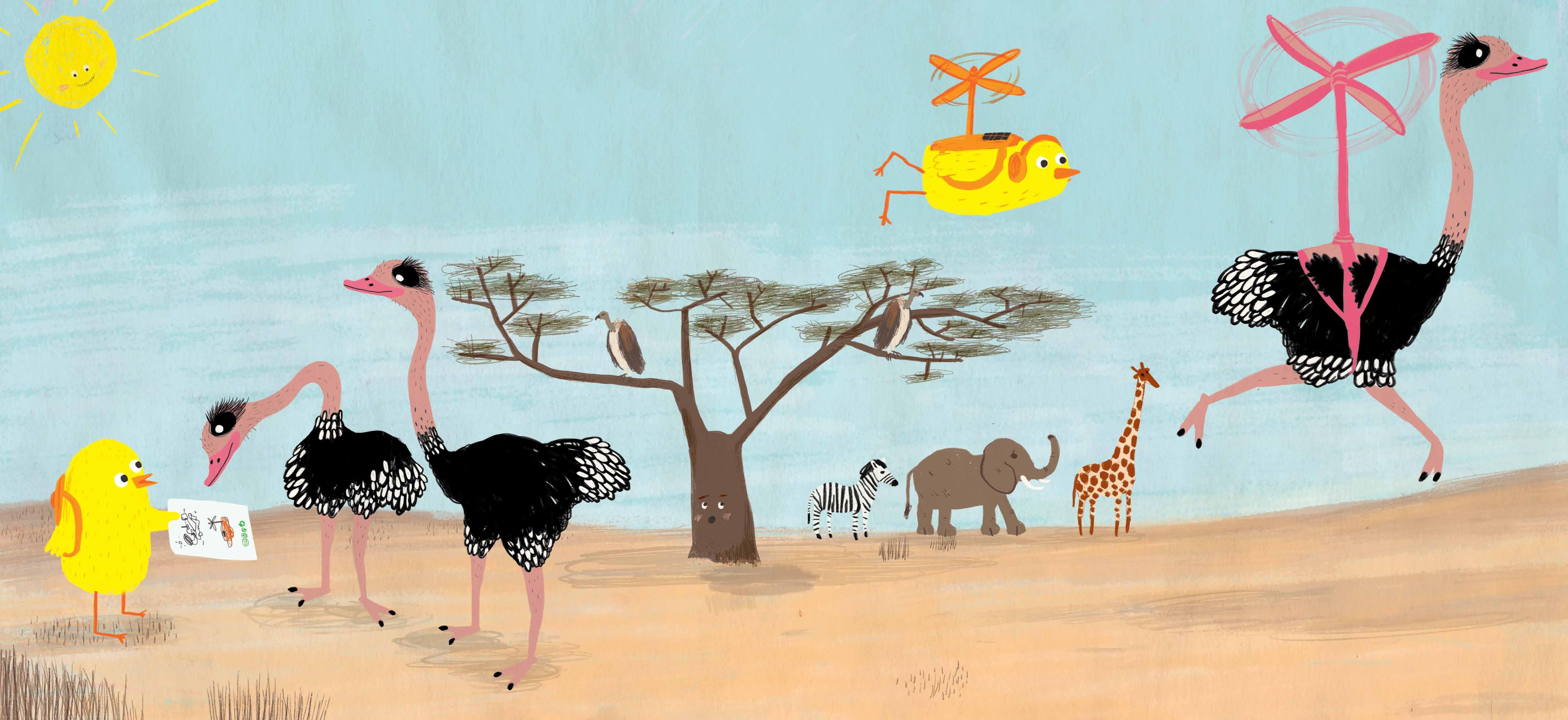 Colaborando adaptaron el invento para poder volar. AVESTRUZ