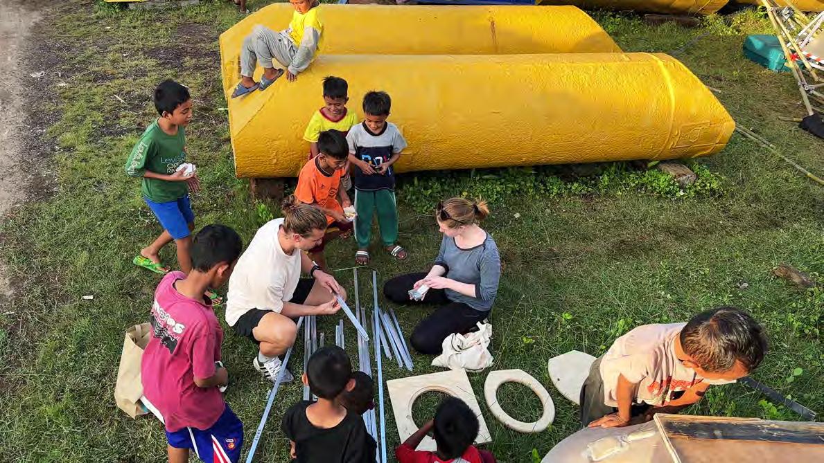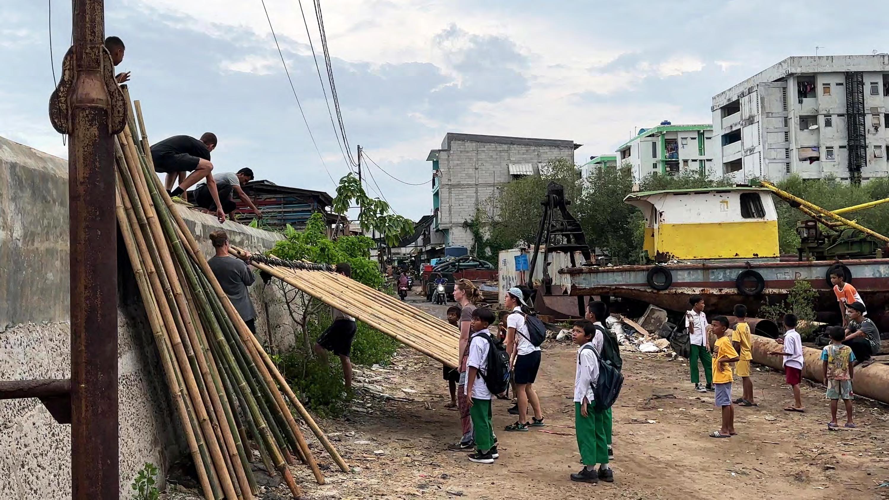 The raft was built on the site with local bamboo bought from a local supplier. The initial idea was the composting containers should also work as floating elements since both require air. After talking to the school’s engineer Daniel Lee had advised us to layer three squares of bamboo on top of each other, which would be enough to keep the toilet floating. His calculations turned out to be correct. We constructed the three layers. With the help of local kids, we transported the raft elements over the sea wall individually due to their heaviness. On the water, 2 meters above ground, they were stacked and tied together. Before the toilet was finished the kids use the raft to play on. After the fieldwork was done, the bamboo was given to a local man who had building plans with bamboo.