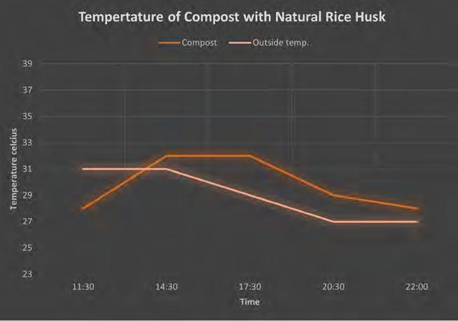 The result from the experiment do suggest the beginning of the elimination of pathogens in the compost with rice husk in Gedung Pompa in North Jakarta. A small temperature rise, in all the samples, suggest the presence of mesophiles bacteria, which is a good indicator that thermophilic bacteria will follow. The best result was seen in the composting sample with compressed rice husk on day 2, with an increase of 6°C to 37°C. This is not a high enough temperature rise to have killed the pathogens, according to the graph by Jenkins, however it is a good start.