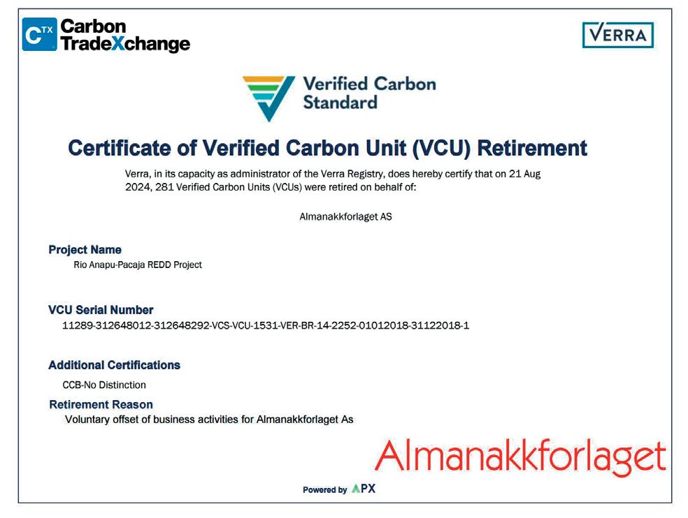 AlmanakkforlagetAS has measured its carbon footprintand compensated organization’s emissionsin total to VCS certifiedREDD+ project