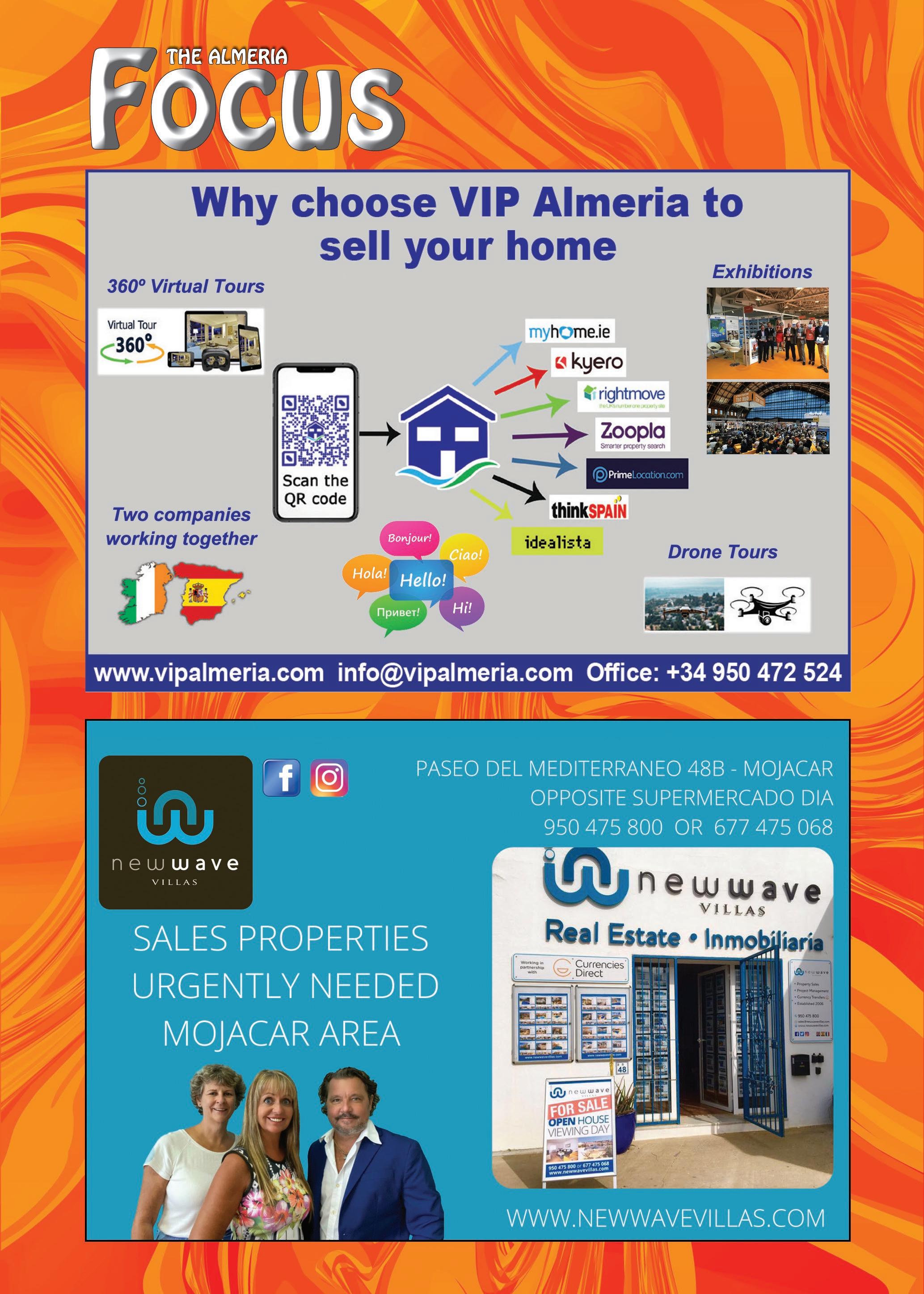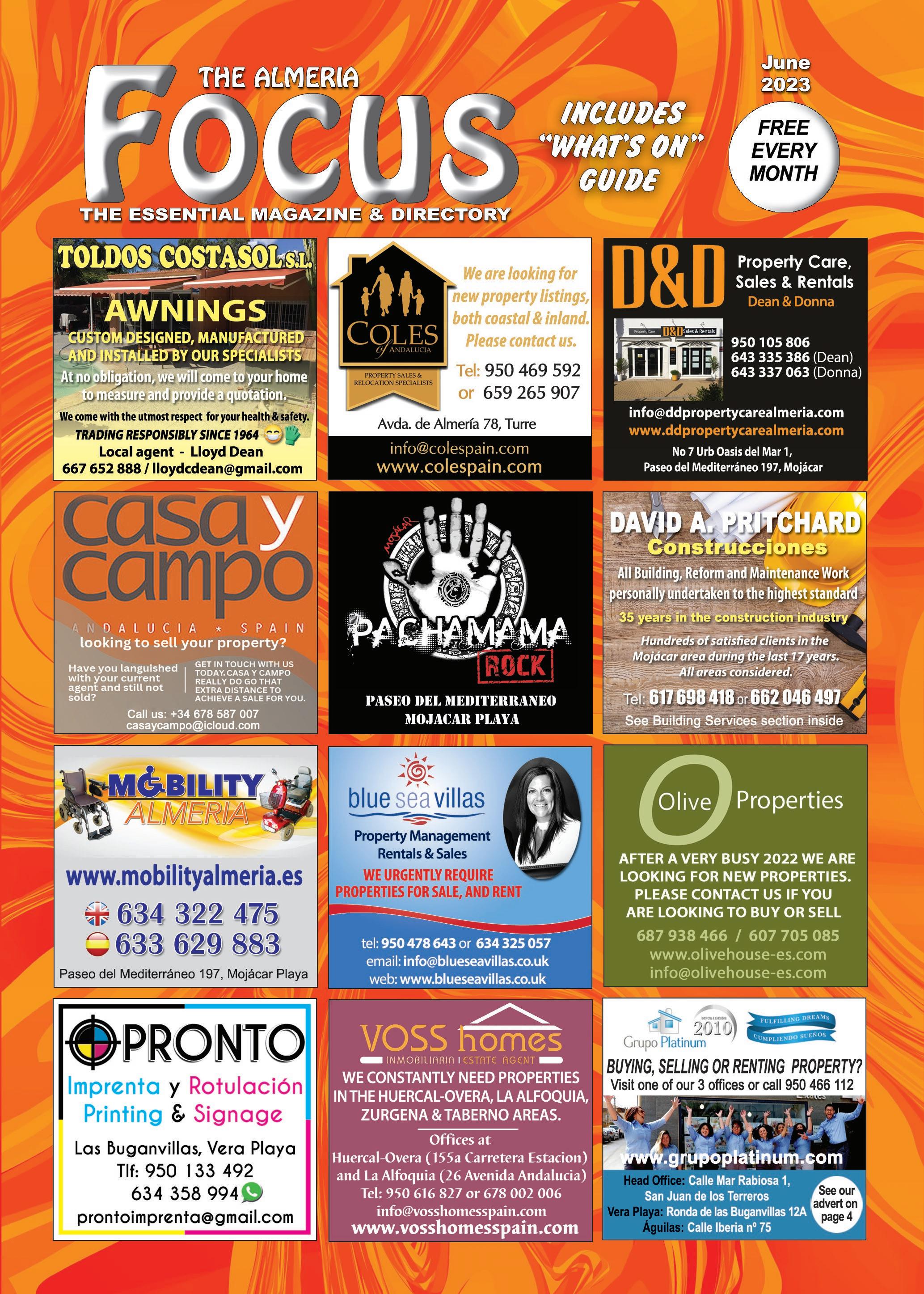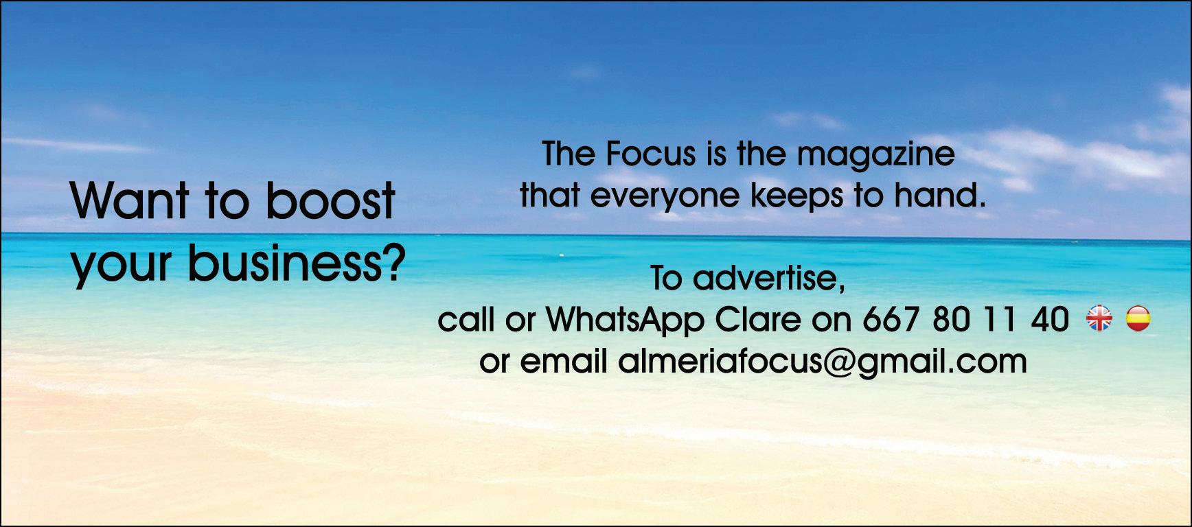The Almería Focus is an independent publication produced and printed in Almería. We cannot be responsible for claims made by advertisers, nor errors in advertisements caused by poor quality submissions. Neither are we responsible for any loss or damage resulting from any error, inaccuracy or non-appearance of an advert. The purchase of advertising space does not give the advertiser ownership of any advert, unless supplied to us as finished artwork or via a design agency. Adverts designed by the Almeria Focus Layout Department, including its photos, logos and specialised fonts remain the property of the Almería Focus magazine and cannot be scanned, partially or fully reproduced, or proofs supplied to other publications. Action will be taken against persons, companies, publishers, printers or distributors who infringe this copyright. Deposito Legal: AL-956-2008 Nº 145
