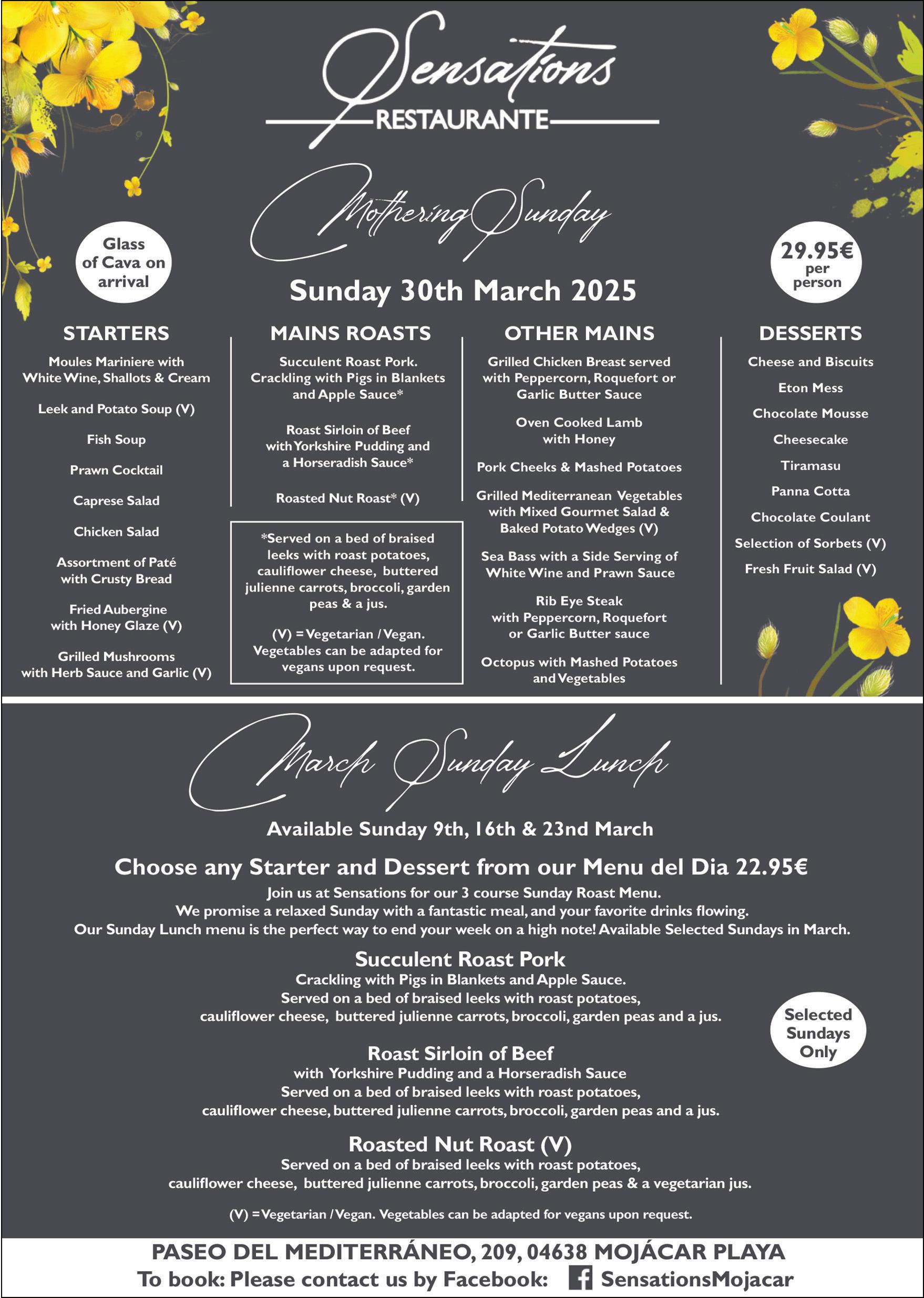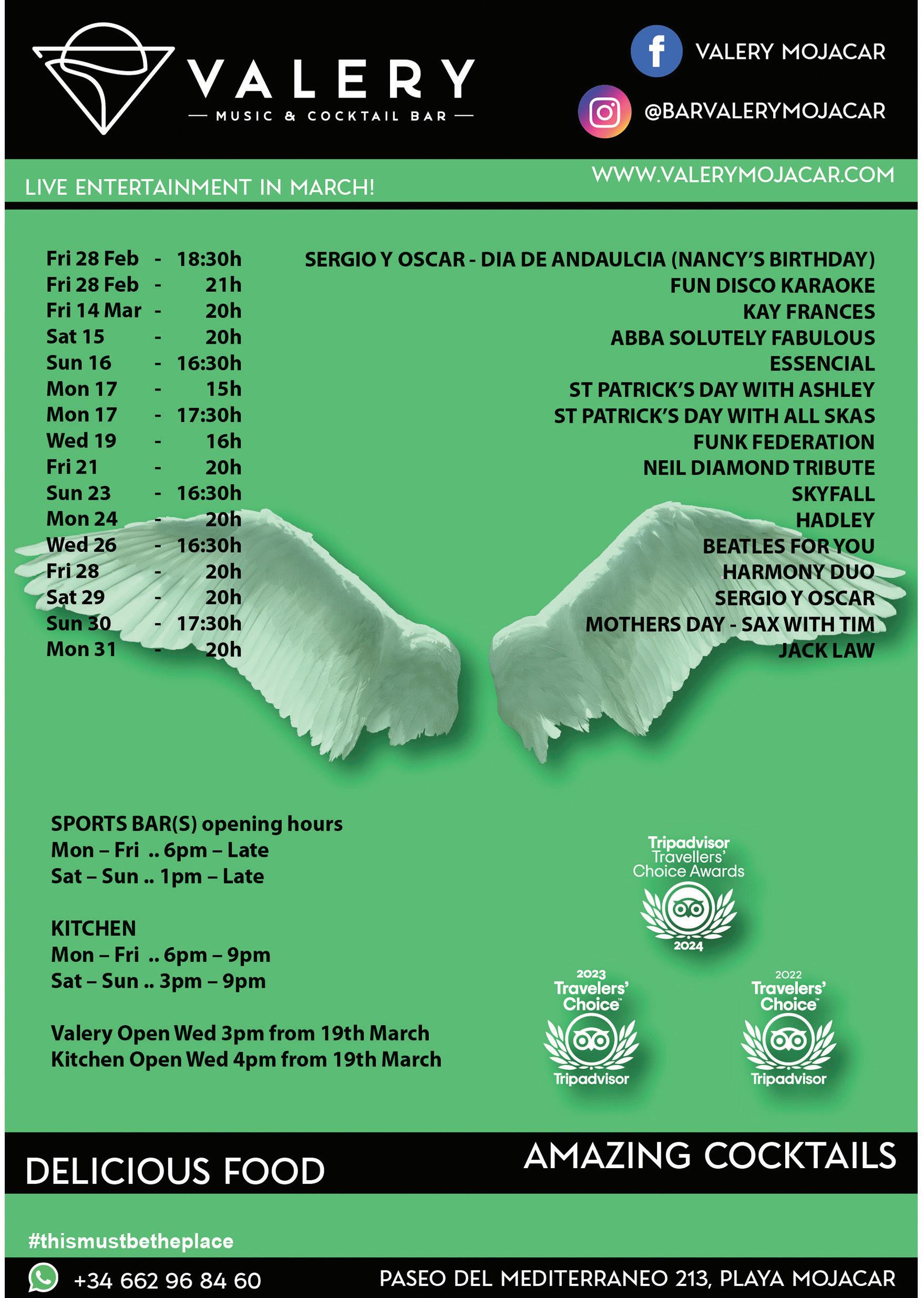 Locally, in the Mojácar and Cuevas del Almanzora areas, there is a very strange event that takes place three Thursdays earlier than Maundy Thursday, and is thought to have started in the 17th century. This is “Día de la Vieja” (“Old Lady Day”) on March 27th this year. Effigies are made of brightly coloured tissue paper wrapped round a wooden cross with the large head filled with sweets. These are taken into the countryside, or in some places near beaches, and children throw stones at the head to get at the sweets. The origin of this is not completely clear, but one explanation is that grannies took their grandchildren into the countryside as a moment of light relief during the solemn period of Lent with no festivities. It also takes place in some municipalities in Málaga, Catalonia and in France. Local businesses will be shut during the afternoon and evening and the time in the countryside is often the scene of barbecues, drinks and a family chin wag. As we do every month, we list events in our area that may be of interest to our readers in our ‘What’s On’ section. Many people will have found that some of the restaurants they like to go to have been shut