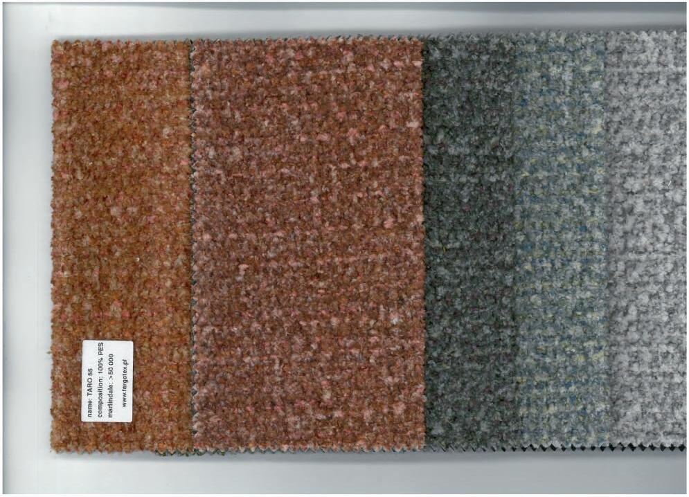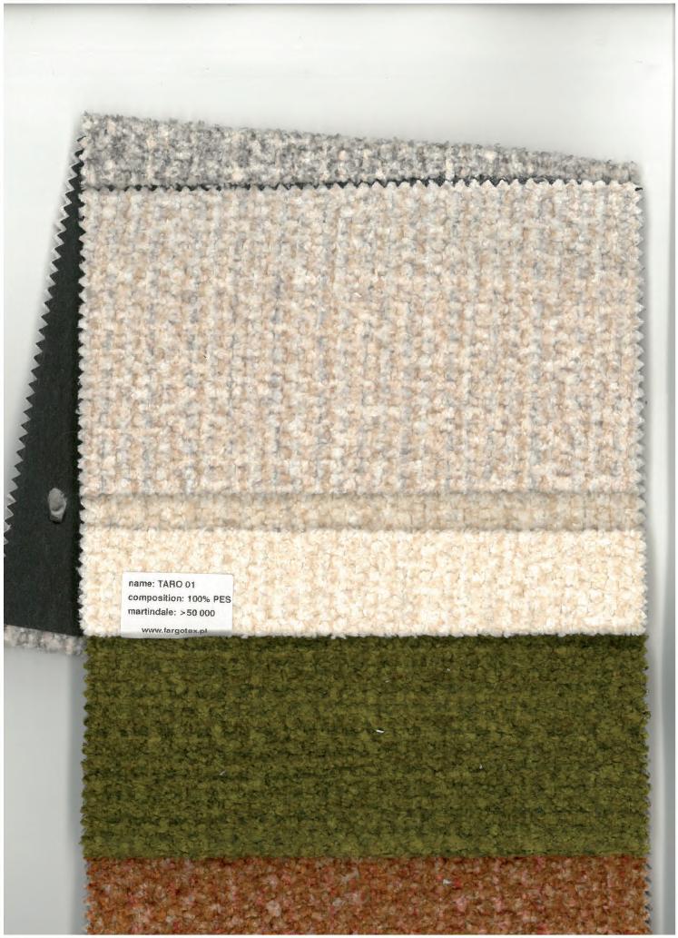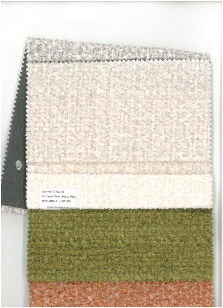 Taro to nieoczywista dzianina szenilowa o melanżowym charakterze. Jest niezwykle przyjemna w dotyku, a jej otulająca faktura zapewnia doświadczenie komfortu i harmonii. Dzięki szerokiej, zróżnicowanej palecie kolorów, w której dominują niuanse lazuru, butelkowej zieleni, oranże, dzianina ta doskonale komponuje się z różnorodnymi przestrzeniami.