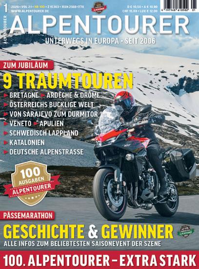 ALPENTOURER ist das Motorrad-Tourenmagazin für die schönsten Routen in Europa. Seit 20 Jahren und bereits 100 Ausgaben liefern wir Anregungen für faszinierende Motorradreisen – in Print und digital. Online mit blätterbarem Flipbook oder offline lesbar als E-Paper. Und mit den GPS-Daten gratis zu jeder Tour.