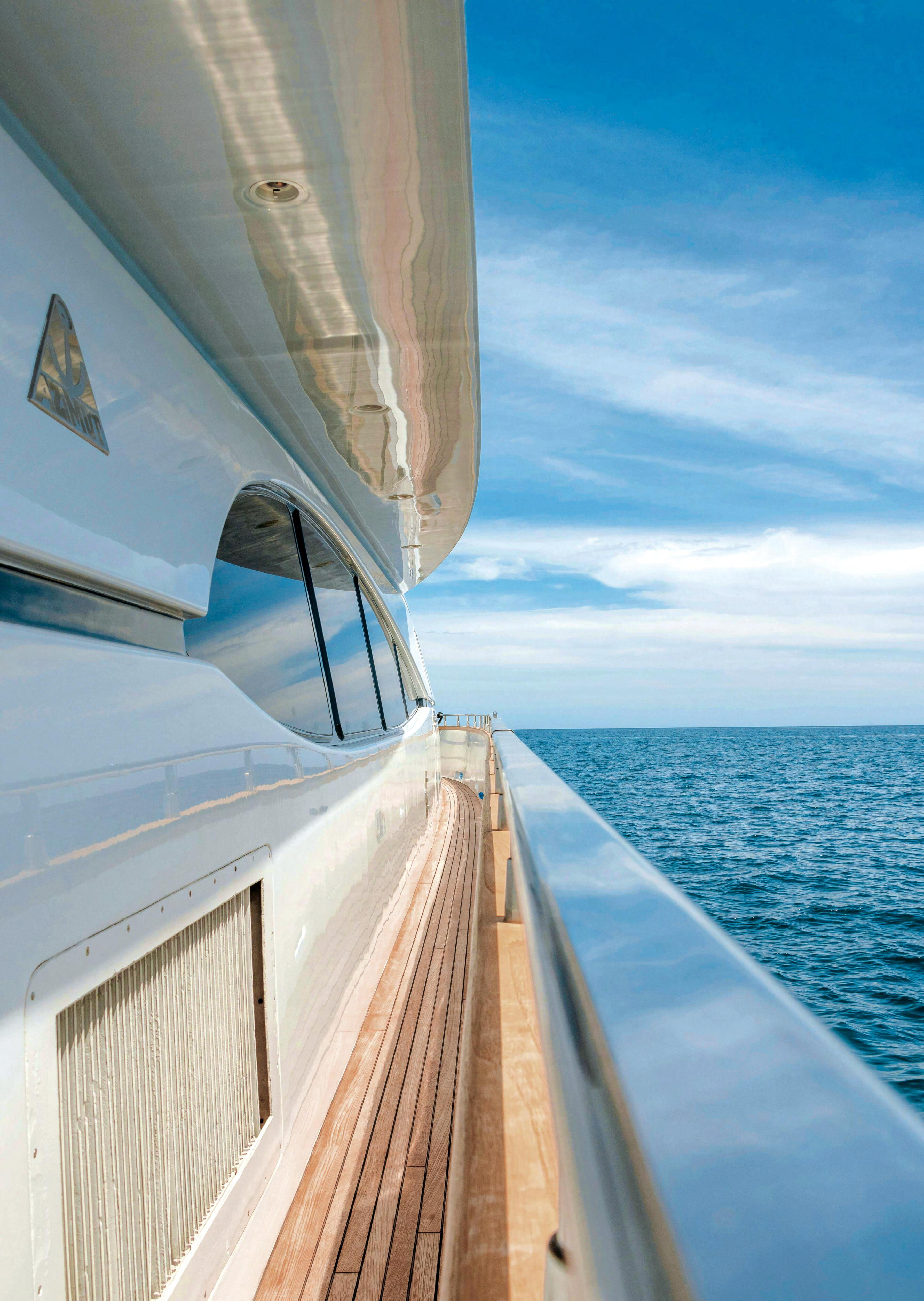 WiTh a hull under 22 MeTers, The neW Model is develoPed on TWo decKs and is P oWered by Three volvo d10 enGines of 900 hP each, reachinG a ToP sPeed of 35 KnoT s