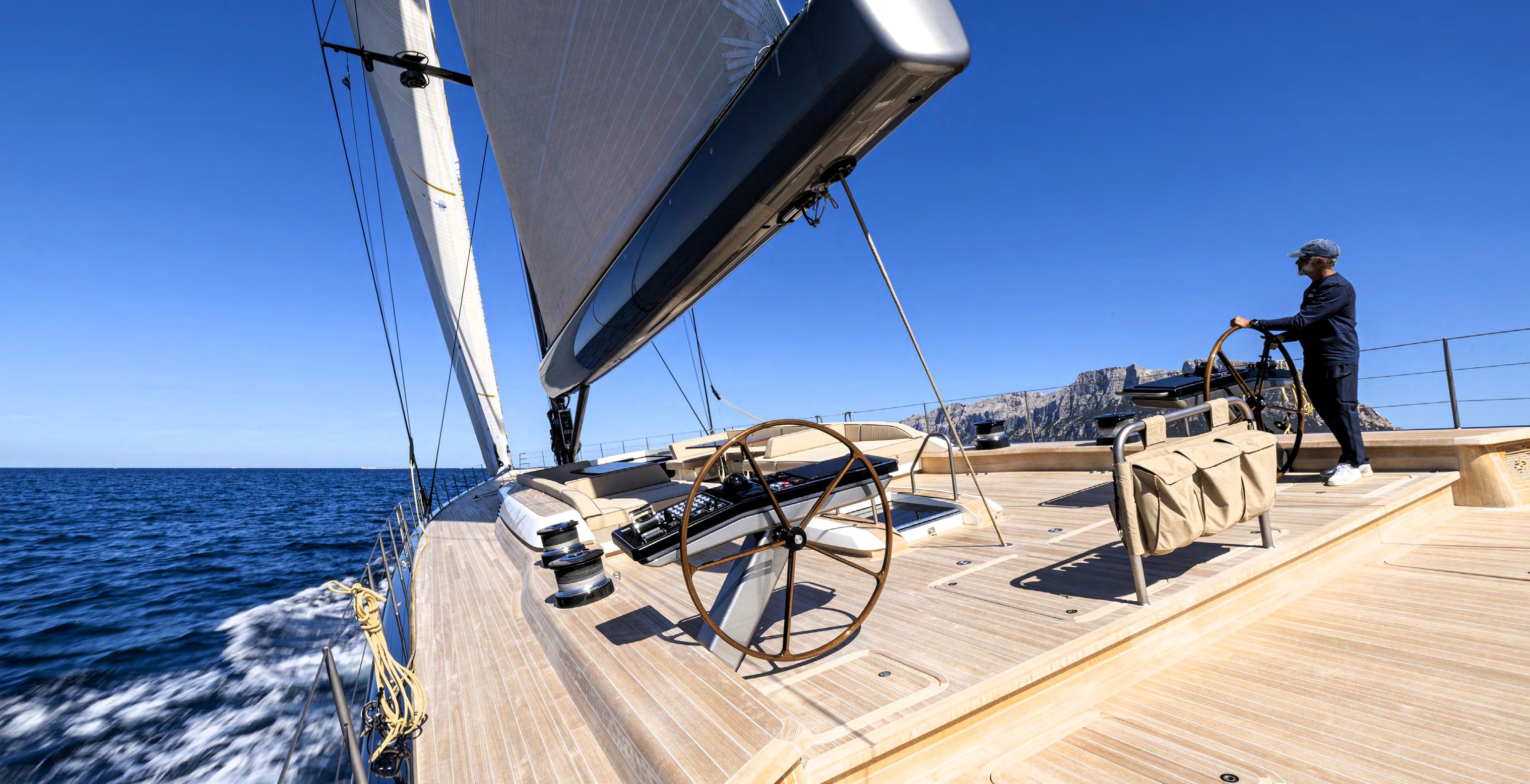 La barca è armata con un albero e boma di carbonio di Southern Spars (installato da RigPro), vele North Sails e rigging Future Fibres con sartie AEROsix e strallo/paterazzo ECsix. L’armatore ha fatto scelte precise riguardo al piano velico: randa full batten tradizionale (no square top), fiocco autovirante per navigare anche in equipaggio ridotto, prua senza bompresso. Riguardo all’attrezzatura di coperta Emanuele Cecchini, direttore commerciale per Emea e Apac di Harken, ha raccontato a SUPER YACHT 24 che “l’obiettivo dell’armatore era avere attrezzatura di coperta ai massimi livelli in termini di performance e peso. Il ponte di coperta spicca per la sua pulizia con appena quattro winch in pozzetto e altri due all’albero. La drizza della randa e le scotte di randa e fiocco autovirante sono infatti gestite da tre winch air captive installati sottocoperta. Si tratta di un’evoluzione dei modelli tradizionali di Harken, più leggeri e dimensionati appositamente per lo svolgimento di manovre specifiche con carichi di lavoro importanti. Quelli di scotta randa e fiocco sono anche abbinati a dei tensionatori, strumenti che servono a mantenere sempre la scotta in tensione nella direzione del captive e quindi sul tamburo ed evitare che si accavallino i colli delle cime sottocoperta, una situazione che può creare danni o problemi in fase di lascata in caso