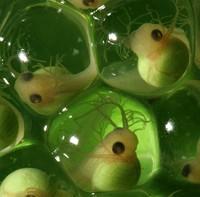 Los huevos de grulla de ojos amarillos miden unos 3 mm de ancho. Los embriones no tienen ojos y luego se vuelven oscuros como los renacuajos. Aunque la tasa de preñez es precisa, responde a la temperatura y el cambio climático hace que las ranas nazcan tarde o temprano, confundiendo a los depredadores y alterando toda la cadena alimentaria.