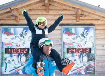 Doch wie gesagt: Dabeisein und Spaß haben ist das Wichtigste. Und Spaß haben wir, auch weil zum Ab schluss noch ein weiterer Höhepunkt wartet, der Selftimer beim Bambylift. Diesen erreichen wir vom Goldknopf aus über die Paradisopiste Richtung vor dere Alm. Die Piste hier ist mit der Funktion „Ski movie“ ausgestattet. Das bedeutet, dass jeder, der aus dem Starthaus fährt, auf der gesamten Renn strecke bis ins Ziel gefilmt wird. Am Ende erfährt man nicht nur seine Laufzeit, sondern hat auch noch ein cooles Video vom eigenen Lauf, welches man mit seiner Skipassnummer unter www.skiline.cc ansehen kann – am besten gleich noch an der Stre cke, wie wir es tun.