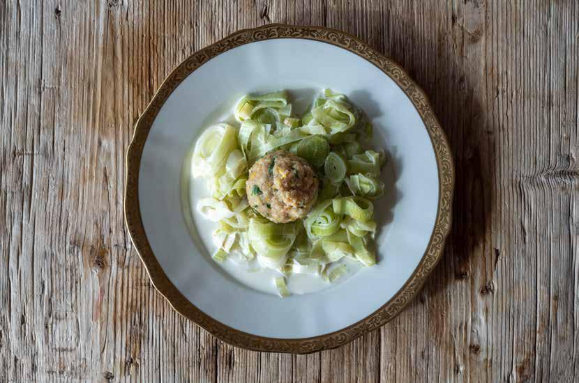 Ridurre lo Schüttelbrot in briciole (non troppo piccole) e unirlo a farina, sale ed erbe. Tagliare gli scalogni a rondelle e grattugiare finemente la carota. Soffriggere le verdure con aglio e olio e aggiungerle all’impasto, cui va incorporato anche il latte con le uova sbattute. Lasciare riposare per un po’. Formare dei piccoli canederli e cuocerli in acqua bollente per 15 min. Nel frattempo, tagliare il porro a rondelle, soffriggerlo leggermente nel burro e insaporirlo con sale e pepe. Servire i canederli sul porro saltato. Buon appetito!