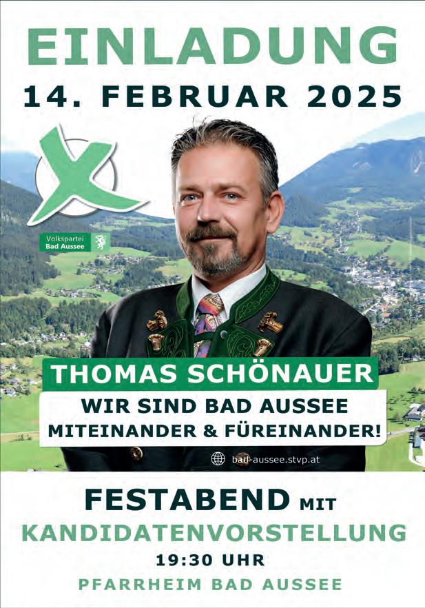 und natürlich die Zweiklassenmedizin zu reduzieren. Wichtig wären gemeinsame Konzepte durch alle Ausseerland Gemeinden mit klaren Forderungen an die Landes- und Bundespolitik. Die Rückabwicklung des Kammerhofplatzes zugunsten der Stadtgemeinde muss abgeschlossen und ein Projekt mit weiterer Bürgerbeteiligung vorangetrieben werden, wie auch der Leerstand von Geschäften aktiv und professionell bearbeitet werden muss“, wie Vzbgm. Robert Margotti abschließend erwähnte. Für die ÖVP (zwölf Mandante) wird Thomas Schönauer als Spitzenkandidat die Wahl bestreiten. Für ihn ist „Bad Aussee eine der wenigen Gemeinden, die keine roten Zahlen schreibt. Es ist uns in den vergangenen Jahren gelungen, trotz großer Projekte – wie dem Umbau der Mittelschule – eine solide Finanzpolitik zu verfolgen und eine Verschuldung zu vermeiden. Wir arbeiten für die Gemeinde, für die Ausseerinnen und Ausseer, für Bad Aussee. Die Aufgaben in unserer Gemeinde sind sinnvoll und erfolgversprechend verteilt, der Kontakt zur Landespolitik ist hervorragend. Mit LH-Stv. Manuela Kohm, die für unsere Bedarfszuweisungen zuständig ist, haben wir auch in Zukunft eine verlässliche Partnerin an unserer Seite, die uns in allen Belangen unterstützen wird.“