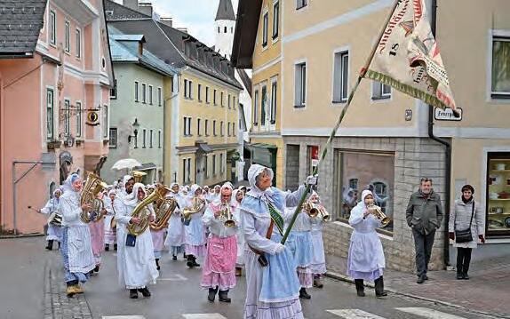 etwas kühl war. Das Stadtzentrum in Bad Aussee füllte sich mit Besuchern und neben den Markter Trommelweibern waren sehr viele Maschkera zu sehen. Übertroffen wurde das Ganze dann am Dienstag: So viele Menschen waren schon seit Jahren nicht mehr zu sehen. Strahlender Sonnenschein, frühlingshafte Temperaturen und alle Brauchtumsfiguren wie auch unzählige Maschkera mit großartigen und phantasievollen Kostümen waren dabei zu sehen. Während die Flinserln um 14 Uhr ihren Zug vom Gasthof „Blaue Traube“ aus starteten, hatten die Unterkainischer Trommelweiber schon eine gehörige Wegstrecke am Buckel und einiges an