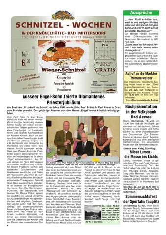 Ausseer Engel-Sohn feierte Diamantenes Priesterjubiläum Am Fest des ‚Hl. Jakobi im Schnitt’ im Jahre 1948 wurde Univ. Prof. Prälat Dr. Karl Amon in Graz zum Priester geweiht. Der gebürtige Ausseer aus dem Hause ‚Engel’ wurde kürzlich würdig gefeiert. Univ. Prof. Prälat Dr. Karl Amon stand und steht mit seiner Heimatpfarre in enger Verbindung. Aussee konnte häufig von seiner wissenschaftlichen Tätigkeit profitieren, wie etwa Forschungen zur Leonhardkirche oder über die Kirchweihfeste der Ausseer Kirchen. Auch von seinen finanziellen Zuwendungen weiß die Pfarre ein Loblied zu singen, wie z. B. die Spende einer Glocke für die Pfarrkirche und vieles mehr, was diesen Bericht sprengen würde. Dass dem Priester Amon die Pfarrkinder auch in seelsorgerischer Hinsicht am Herzen lagen ist für einen ‚Engel’ selbstverständlich. Am 27. Juni verlieh die Pfarre Bad Aussee dem Jubilar den Ehrenring in Gold. An diesem Festabend stellten sich zahlreiche Gratulantinnen und Gratulanten aus Kirche und Politik ein. Vizerektorin Univ. Prof. Dr. Irmtraut Fischer überbrachte die Glückwünsche der Theologischen Fakultät Graz, Mag. Joachim Heinz gratulierte im Namen der evangelischen Gemeinde, Bgm. Otto Marl beglückwünschte, der Stadtpfarrer von Leoben, Dr. Markus Plöbst, sprach die Laudatio. Den Abend umrahmte das Quartett Holzinger mit alpenländischen und religiösen Gesängen. Der Jubilar selbst hielt den Festvortrag. Mit wissenschaftlichem Feuer und lebendigem Duktus referierte Univ. Prof. Prälat Dr. Karl Amon, fundierter Historiker und Christ aus innerer Überzeugung, über die Entstehung der Kirchen und der Pfarren des Ausseerlandes. Der 4