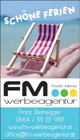 Für den Inhalt verantwortlich: Florian Seiberl. Druck: Druckerei WALLIG, 8962 Gröbming. Erscheinungsweise: 14-tägig. Einzahlungen auf das Konto AT764501030400030000 bei der Volksbank Salzburg. Aufgrund der Lesbarkeit der Artikel wird bei Bedarf nur eine Geschlechtsform gewählt. Dies bedeutet jedoch keine Benachteiligung des anderen Geschlechtes. Die mit ß versehenen Artikel sind bezahlte Anzeigen. Die Redaktion behält sich das Recht vor, zugesandte Leserbriefe zu kürzen und übernimmt keine Haftung für den Inhalt kostenloser Ankündigungen. Alle Rechte vorbehalten. Druck- und Satzfehler vorbehalten.