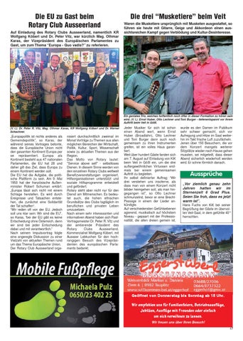 nisiert durchschnittlich zweimal im Monat Vorträge zu Themen aus allen möglichen Bereichen der Wirtschaft, Politik, Kultur, Sport, Wissenschaft sowie zu aktuellen Themen aus der Region. Das Motto von Rotary lautet: "Service above self" - selbstloses Dienen. In diesem Sinne werden von den einzelnen Rotary Clubs weltweit Benefizveranstaltungen organisiert, Hilfsorganisationen unterstützt und soziale Hilfsprogramme entwickelt und gefördert. Rotary steht aber nicht nur für den Dienst am Mitmenschen. Es bedeutet auch, die hohen ethischen Grundsätze des Clubs tagtäglich im beruflichen und privaten Leben umzusetzen. Nach einem sehr interessanten und informativen Abend haben sich PastVortragsmeister Dr. Peter R. Vitz und der amtierende Präsident des Rotary Clubs Ausseerland, Kommerzialrat Wolfgang Köberl, mit Ausseer Lebkuchen für den hochrangigen Besuch des Vizepräsidenten des europäischen Parlaments bedankt.